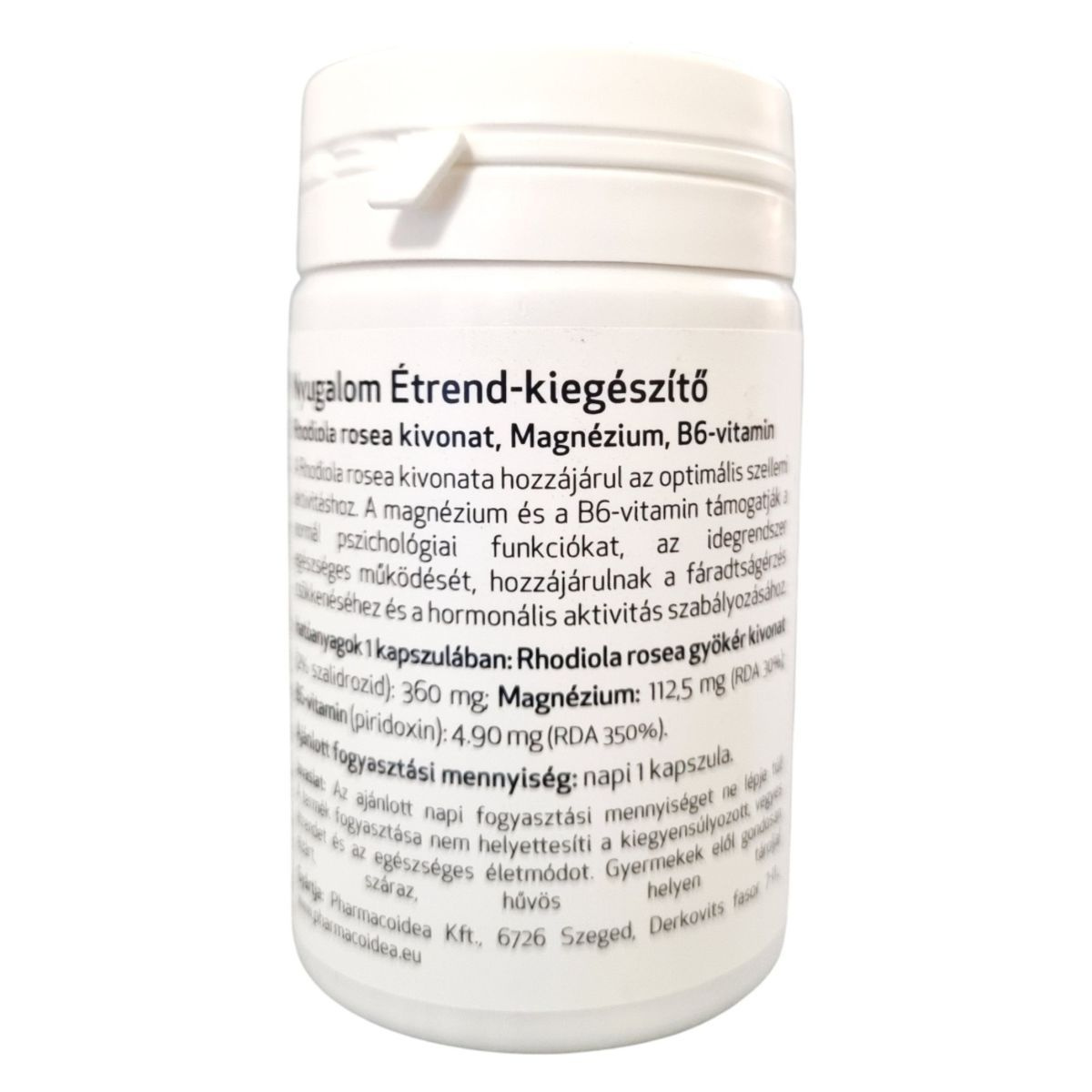 A Pharmacoidea Nyugalom étrend-kiegészítő Rhodiola rosea kivonatot, magnéziumot és B6-vitamint tartalmaz, amelyek hozzájárulhatnak az optimális szellemi aktivitáshoz, a normál pszichológiai funkciók támogatásához, az idegrendszer egészséges működéséhez, a fáradtságérzés csökkenéséhez és a hormonális aktivitás szabályozásához. A termék napi ajánlott fogyasztási mennyisége 1 kapszula, amely biztosítja a szükséges hatóanyagokat. A termék fogyasztása nem helyettesíti a kiegyensúlyozott étrendet és az egészséges életmódot. Gyermekek elől gondosan elzárva, hűvös, száraz helyen tárolandó. Gyártja a Pharmacoidea Kft., Szegeden.