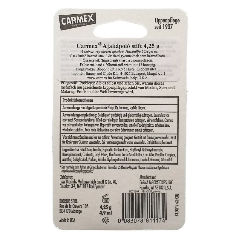 A Carmex ajakápoló stift gyors és hatékony segítséget jelent a száraz, repedezett ajkak számára, hidratáló és fényvédő összetételének köszönhetően. SPF15 fényvédővel van ellátva, hogy a nyári napsütés se lehessen akadály! Néhány perccel indulás előtt kenje fel, hogy kifejthesse hatását! Szilárd állagú, tekerős stift, azoknak, akik a megszokott kiszerelésű ajakápolókat kedvelik.