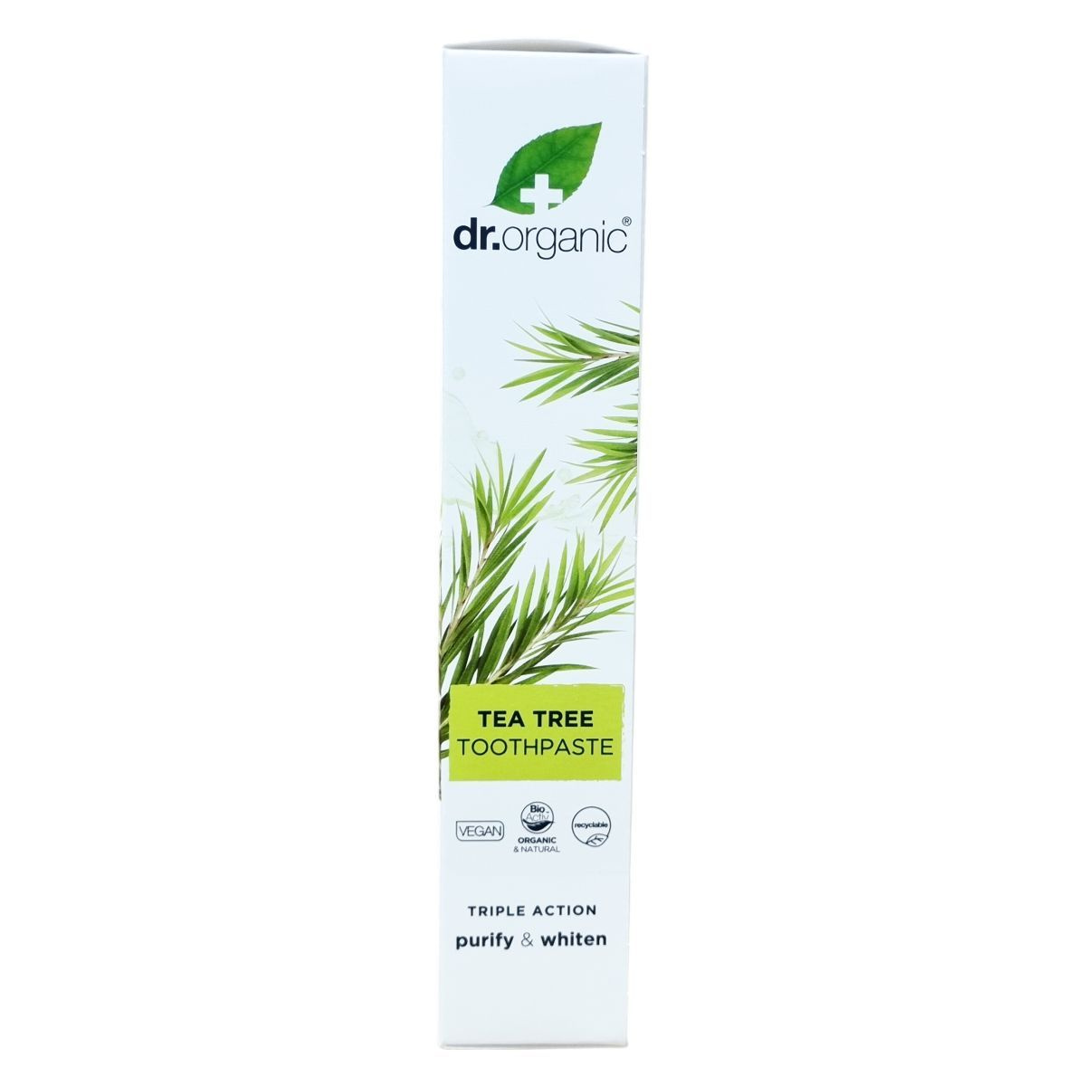 A dr.organic® TEA TREE fogkrém organikus és természetes alapanyagokból készül, és bio aktiv összetevőket tartalmaz, amelyek hozzájárulnak a fogak tisztaságához és egészségéhez. A termék újrahasznosítható csomagolásban érkezik, és állatkísérlet-mentes minősítéssel rendelkezik. A fogkrém nátrium-monofluorofoszfátot tartalmaz, amely 1000 ppm fluoridot biztosít a fogszuvasodás elleni védelemhez. A használati útmutató szerint a terméket orális használatra fejlesztették ki, és a gyermekfogmosás során szigorú felügyelet mellett alkalmazandó, különösen 6 év alatti gyermekek esetében. A termékben lévő hatóanyagok között szerepel a bio teafaolaj, mentalevél olaj, valamint izlandi zuzmó kivonat, amelyek tisztító és frissítő hatásúak. A csomagolás jelzése alapján 12 hónapig használható a felbontás után. A gyártás helye Olaszország.