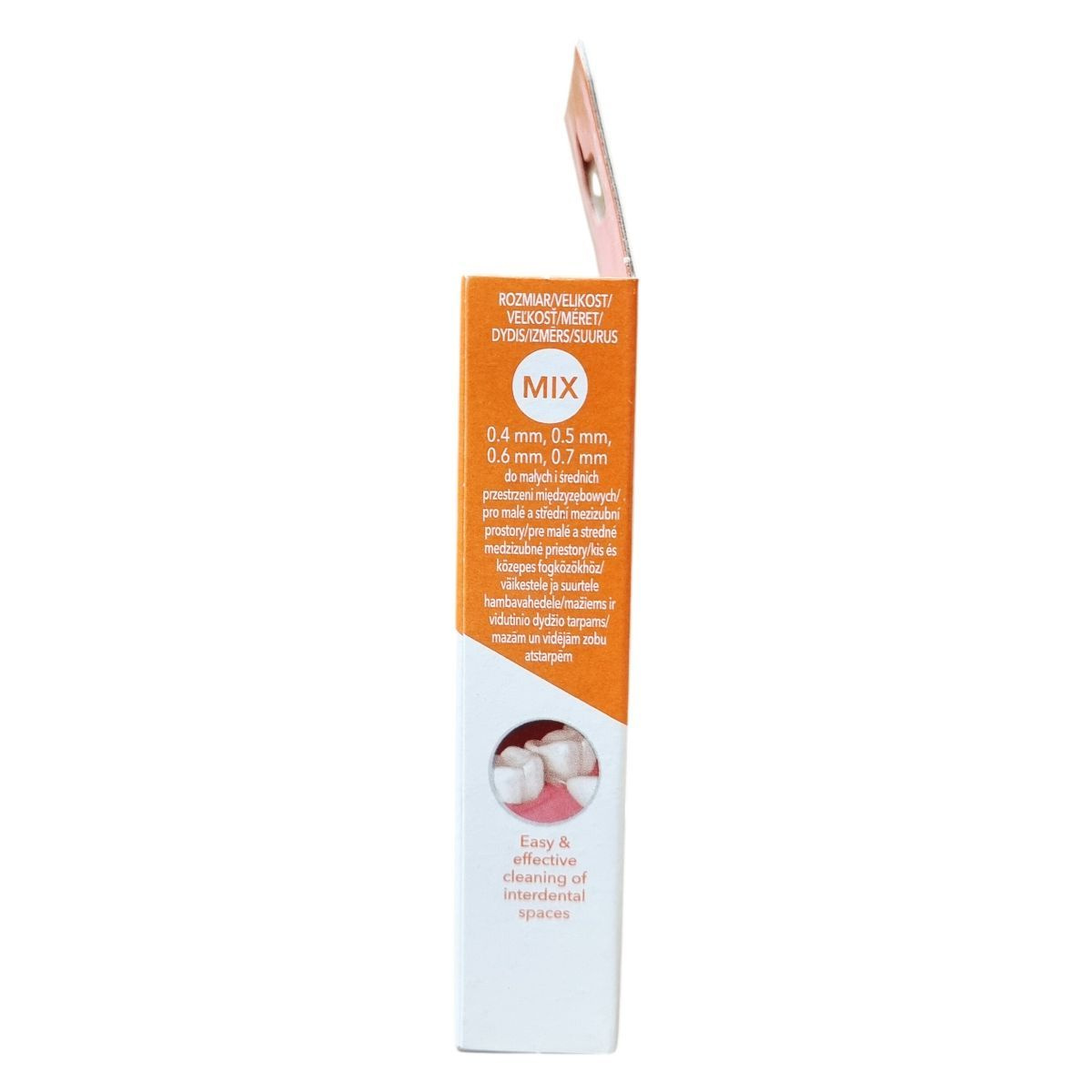 Az elmex interdental kefék többféle méretben (0,4 mm, 0,5 mm, 0,6 mm és 0,7 mm) kaphatók, így ideálisak kis és közepes méretű fogközök tisztítására. A készlet egy mix csomagot tartalmaz, nyolc kefét és egy higiénikus tároláshoz használható utazó fedőt. A kefék spirál alakú, puha sörtéi hatékonyan távolítják el a lepedéket, miközben a flexibilis, bevont, lekerekített véggel ellátott drót könnyű és kíméletes bevezetést biztosít a fogközökbe. Csúszásgátló markolata megkönnyíti a kezelést. Különösen ajánlott fogszabályzó, híd vagy implantátum viselők számára, az egyszerű és hatékony interdentalis tisztítás érdekében. A termék kartoncsomagolása több mint 70%-ban újrahasznosított anyagból készül, ezzel is támogatva a fenntarthatóságot és a víztakarékosságot.
