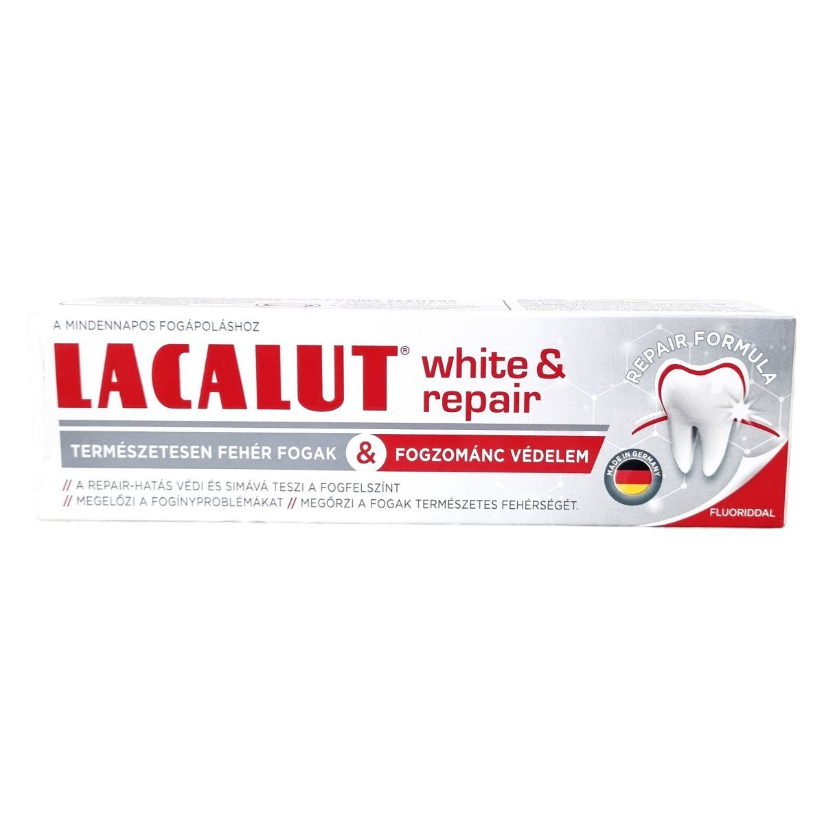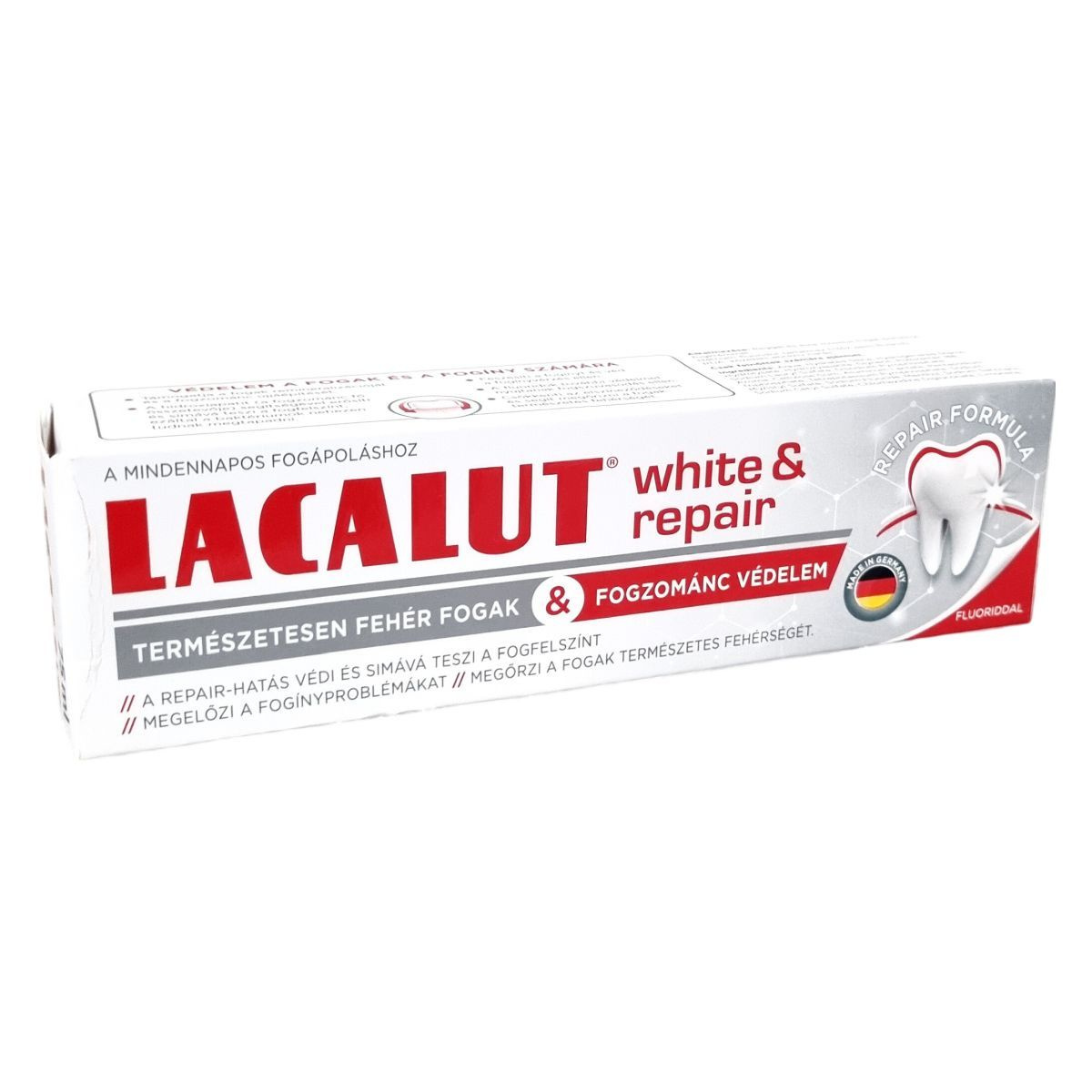 A Lacalut white & repair fogkrém védi és simává teszi a fogzománcot, csökkenti a lepedékképződést, megelőzi a fogínyproblémákat, és segít megőrizni a fogak természetes fehérségét.