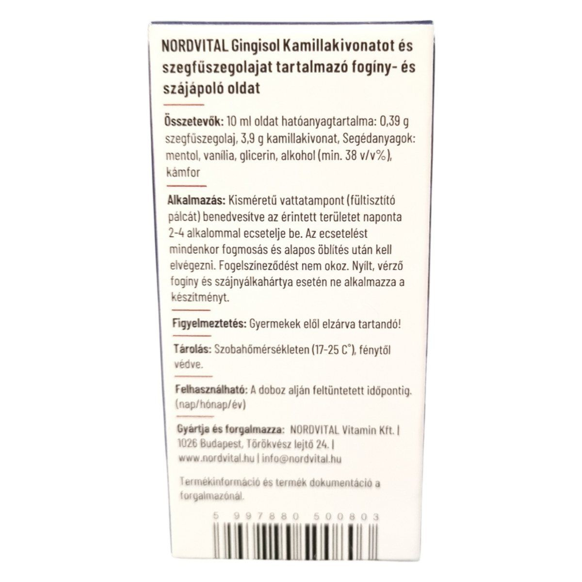 A Nordvital Gingisol 10 ml-es fogíny- és szájápoló oldat kamillakivonatot és szegfűszegolajat tartalmaz, amelyek hagyományosan a szájüreg tisztítására és ápolására használatosak. A kamilla gyulladáscsökkentőként, a szegfűszeg összehúzó és fertőtlenítő hatásáról ismert, míg a mentol hűsítő élményt biztosíthat. A készítmény rendszeres használata hozzájárulhat a száj komfortérzetének fenntartásához, fogmosást követően frissítő kiegészítést nyújtva. Nem okoz elszíneződést, egyszerűen használható ecsetelés formájában. A termék kis kiszerelése praktikus, így könnyen beilleszthető a mindennapi szájápolási rutinba.