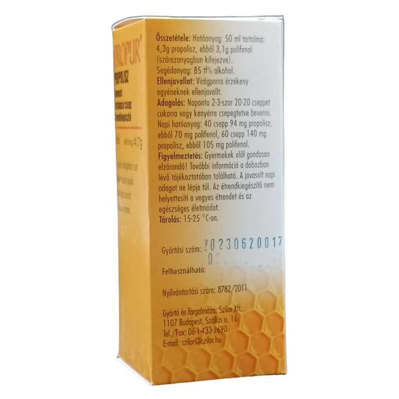 Mi a Propur csepp hatóanyaga? 50 ml készítmény tartalmaz 4.3 g propolisz kivonatot (Propolis extractum)(szárazanyagban kifejezve). Mit tartalmaz még a készítmény? Segédanyagként a készítmény tartalmaz még 85 tf%-os alkoholt, mely adagonként 0.57 g alkoholnak felel meg. Mikor ajánlott a készítmény alkalmazása? A Propur csepp alkalmazása ajánlható: általános erősítésre, étvágyjavításra, enyhe fertőzések miatti szájüregi és felső légúti megbetegedések (pl. torokgyulladás) megelőzésére illetve enyhítésére önállóan vagy a gyógyszeres terápia kiegészítéseként, gyomor-, bél- és húgyivar-rendszerben fellépő gyulladások mérséklésére.