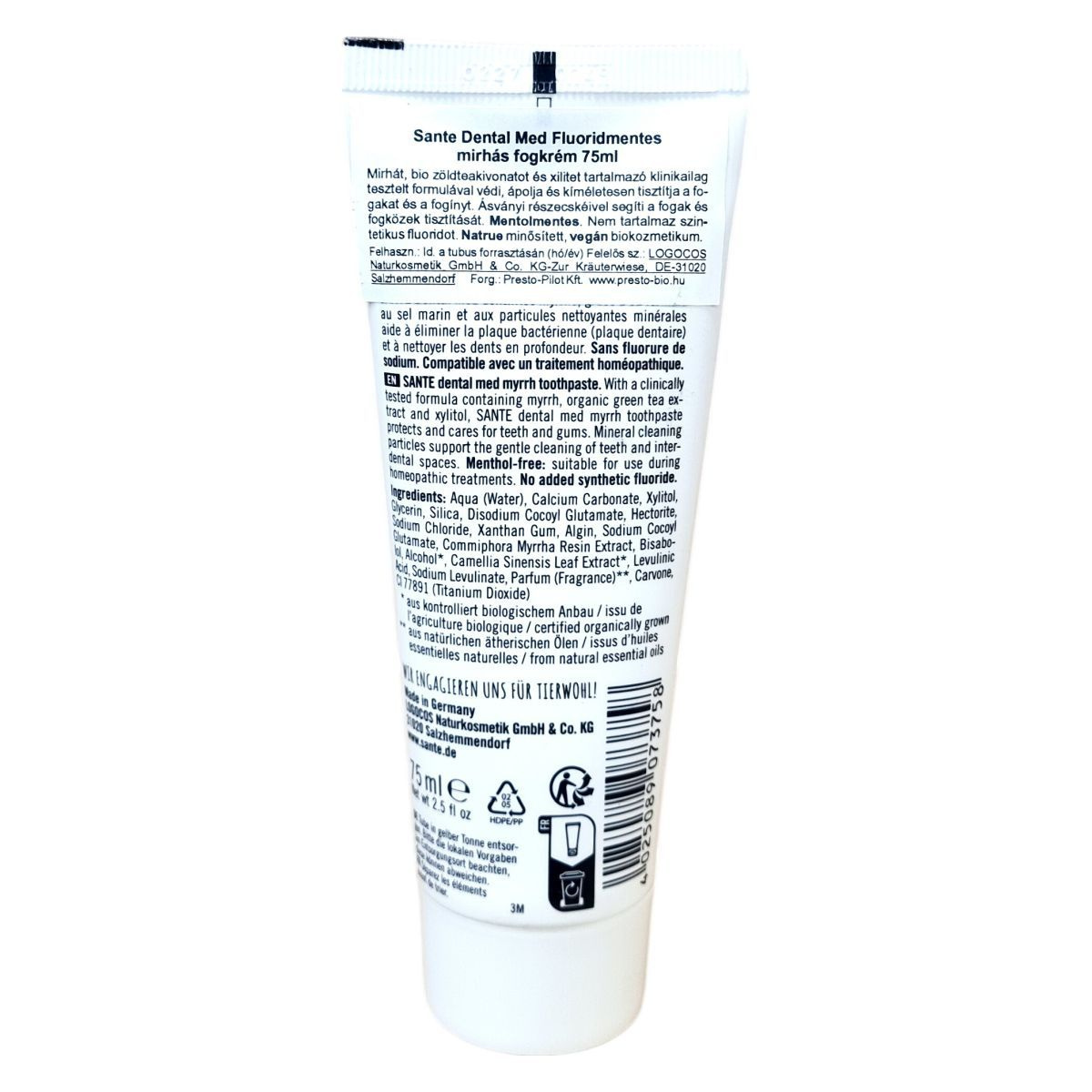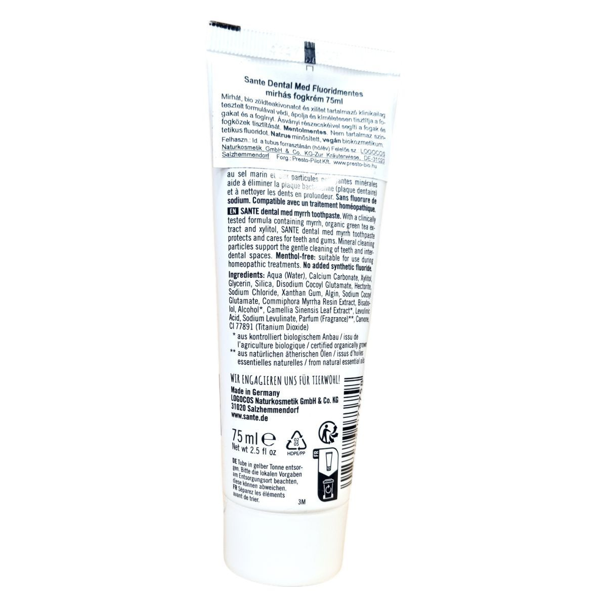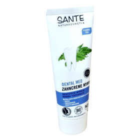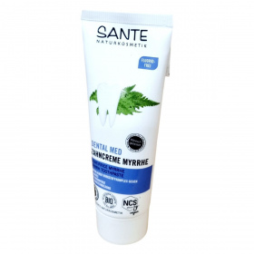 A SANTE Dental Med mirhás fogkrém egy klinikailag tesztelt, fluoridmentes fogkrém, mely a természetes összetevők erejével segít megelőzni a fogszuvasodást, a parodontózist és a fogkő kialakulását. A mirha, a bio zöldteakivonat és a xilit védik és ápolják a fogakat és fogínyt, miközben az ásványi részecskék kíméletesen tisztítják a fogak és a fogközök felületét. A termék mentolmentes, ezért kompatibilis a homeopátiás kezeléssel, és nem tartalmaz szintetikus fluoridot. Vegán és Natúrkozmetikumként minősített biotermék. A csomagolás a helyi előírásoknak megfelelően, a sárga gyűjtőedénybe helyezendő.