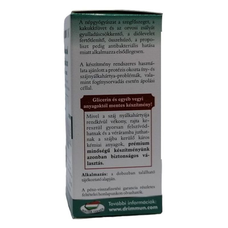 A népgyógyászat a szegfűszeget, a kakukkfüvet és az orvosi zsályát gyulladáscsökkentő, a diólevelet fertőtlenítő, összehúzó, a propoliszt pedig gomba- és vírusölő, valamint gyulladáscsökkentő hatása miatt alkalmazza elsősorban. Glicerin és egyéb vegyi anyagoktól mentes készítmény! Mivel a száj nyálkahártyája rend-kívül vékony, rajta keresztül gyorsan felszívód-hatnak, és a véráramba juthatnak a szájba kerülő kémiai anyagok. Termékünk azonban 100%-ban természetes, így alkalmazása során nem jut vegyi anyag a szervezetbe!