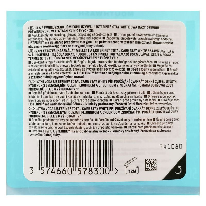 A Listerine Stay White antibakteriális szájvíz illóolaj összetevőket tartalmaz: eukaliptol, timol, mentol és metil-szalicilát.