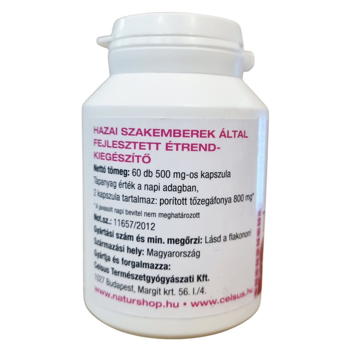 A Celsus Tőzegáfonya kapszula egy hazai szakemberek által fejlesztett étrend-kiegészítő, amely 60 darab, egyenként 500 mg-os kapszulát tartalmaz. A kapszulák fő összetevője a porított tőzegáfonya (Vaccinium macrocarpon), amelyet a termék széles körű használatra ajánl napi két kapszula fogyasztásával, bőséges folyadékkal. A termék Magyarországon készül és forgalmazza a Celsus Természetgyógyászati Kft., biztosítva a minőségi hazai előállítást. Az étrend-kiegészítő használata mellett fontos a vegyes étrend és az egészséges életmód fenntartása. A palackon feltüntetett gyártási szám és minőségmegőrzési információk segítenek a termék azonosításában és frissességének ellenőrzésében.