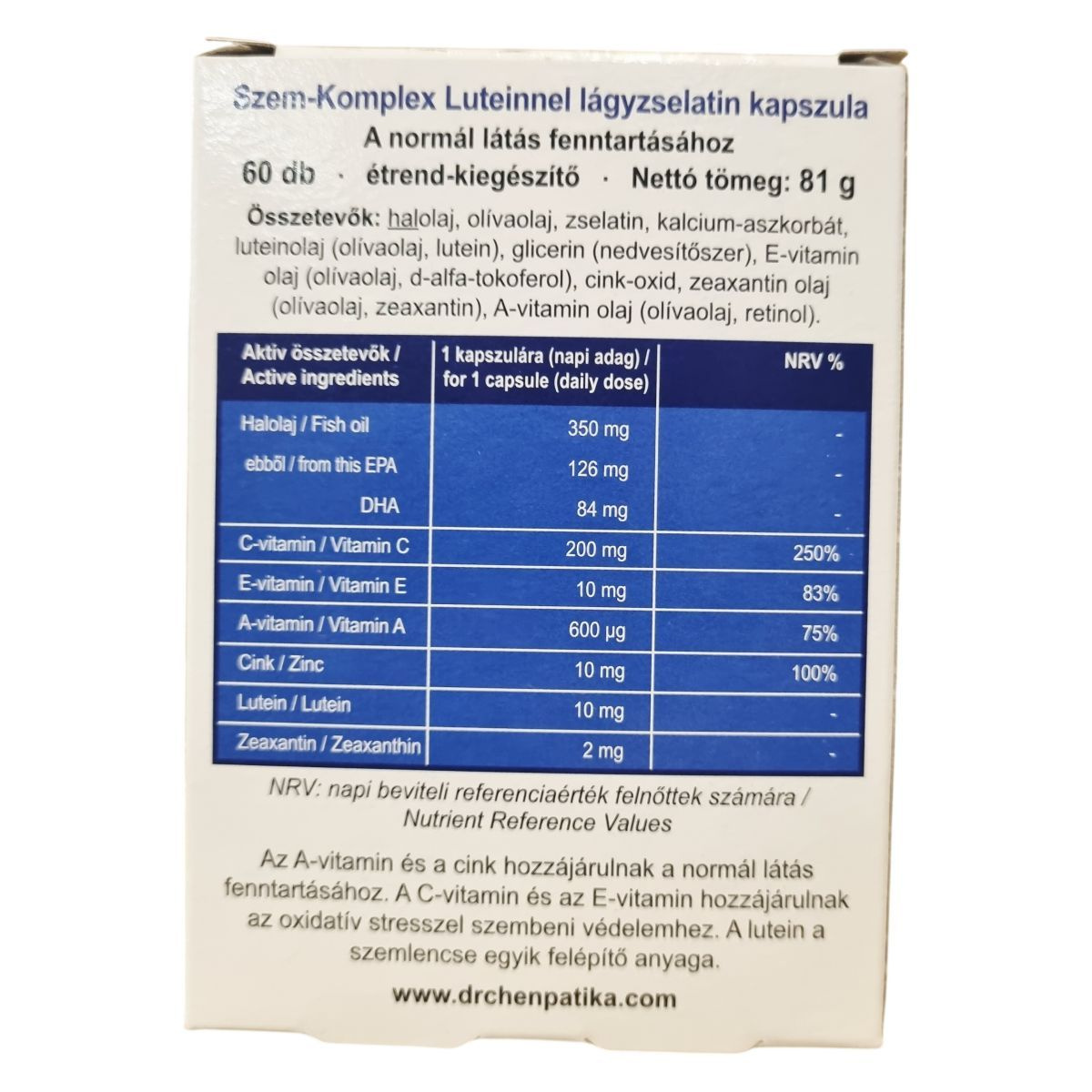 A-vitamin és a cink hozzájárulnak a normál látás fenntartásához. A C-vitamin és az E-vitamin hozzájárulnak az oxidatív stresszel szembeni védelemhez. A lutein a szemlencse egyik felépítő anyaga.