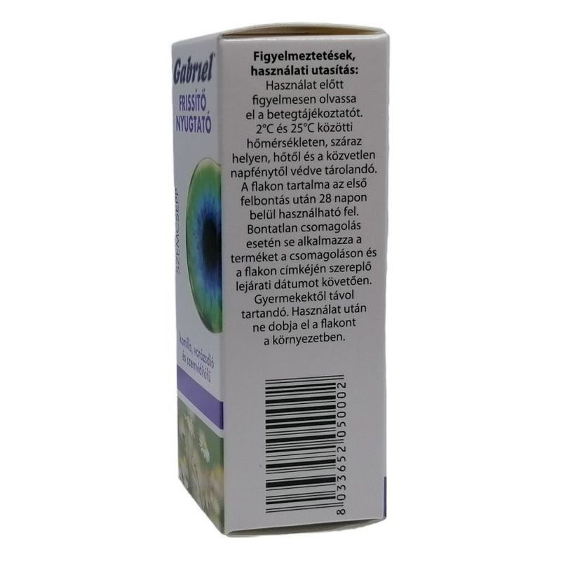 A Gabriel Frissítő szemcsepp egy varázsdiót, kamillát és szemvidítófüvet tartalmazó növényi desztillátum.