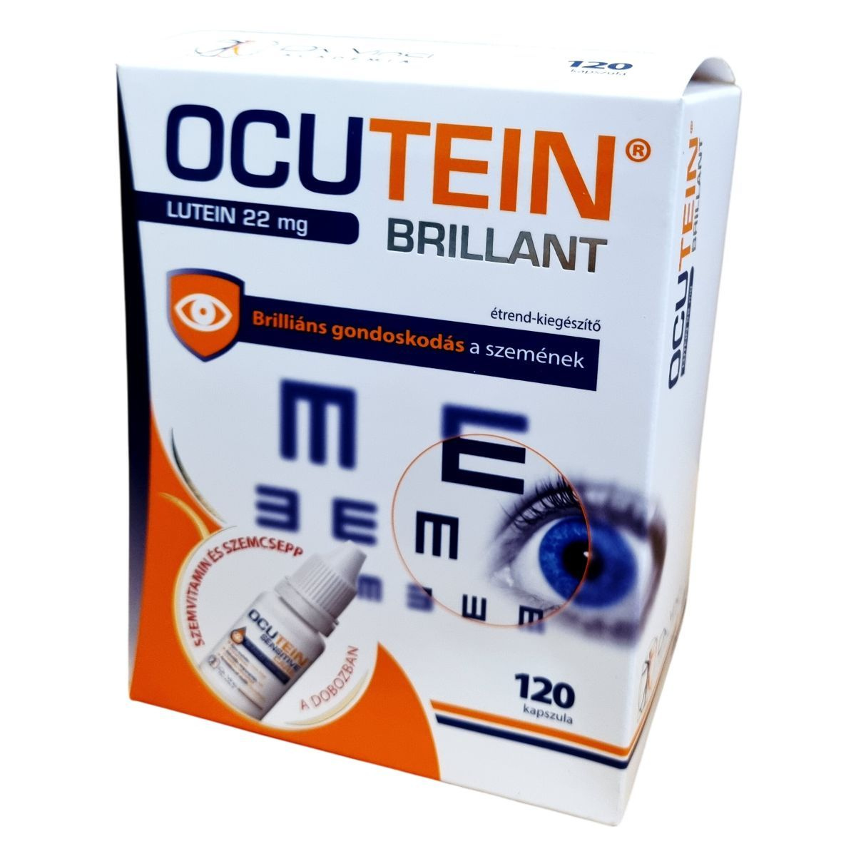Az OCUTEIN® BRILLANT Lutein 22 mg egy étrend-kiegészítő, amely a szem egészségének támogatására szolgál. A termék három fő komplexet tartalmaz: a Karotinoid Komplexet (lutein, zeaxantin, A-vitamin), amely a normál látás megőrzésében játszik szerepet; a Mikroelem Komplexet (cink, réz, szelén), amely hozzájárul a sejtek oxidatív stressz elleni védelméhez; és az FFK Komplexet (folsav, foszfatidil-kolin), amely a normál homocisztein anyagcserében és a sejtmembránok építésében vesz részt. A termék 120 kapszulát tartalmaz, amely 4 havi adagot jelent. Az OCUTEIN SENSITIVE CARE szemcsepp is megtalálható a csomagban, amely enyhíti a szemszárazságot és az irritációt.
