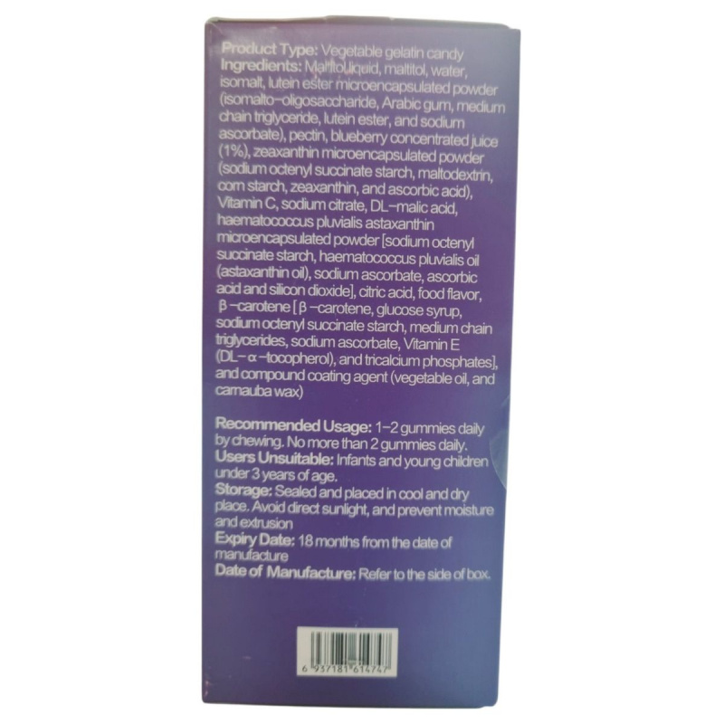 A Tiens Lutein Ester Gummy egy növényi alapú gumicukor, mely lutein-észtert, zeaxanthint és haematococcus pluvialis kivonatból származó asztaxantint tartalmaz. A készítmény célja a szem védelme és az oxidatív stressz csökkentése, miközben finom és praktikus formában biztosítja a hatóanyagokat. Az áfonya koncentrátum és természetes aromák tovább fokozzák a termék vonzerejét.