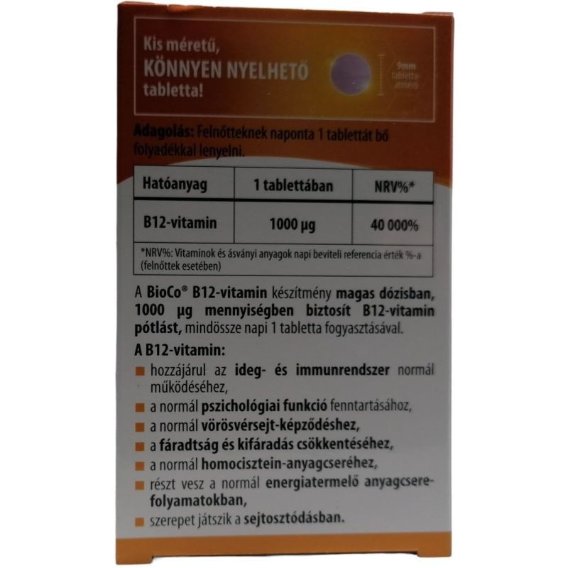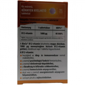 A BioCo B12-vitamin készítmény magas dózisban, 1000 μg mennyiségben biztosít B12-vitamin pótlást, mindössze napi 1 tabletta fogyasztásával.
