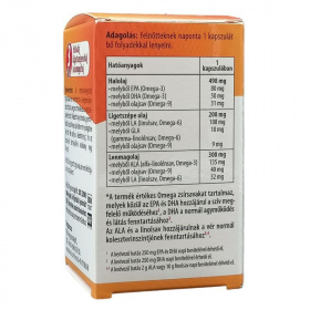 Rendszeres - legalább heti kétszeri - tengeri hal fogyasztással elősegíthetjük a szervezet számára értékes Omega 3 zsírsavak bevitelét. A tengeri halakban található két Omega 3 zsírsav, az EPA és a DHA hozzájárul a vér normál triglicerid szintjének megtartásához, az egészséges szívműködéshez és a normális véralvadás fenntartásához. Az Omega 3 zsírsavak elősegítik a normális vérnyomás megőrzését. Az alfa-linolénsav (ALA) szintén többszörösen telítetlen Omega 3 zsírsav, melynek megfelelő fogyasztása hozzájárul a vér összes és LDL koleszterin szintjének normál értéken tartásához. Összetevők: halolaj; lenmagolaj; zselatin kapszulahéj; ligetszépe olaj; nedvesítőszer (glicerin), antioxidáns (D-alfa-tokoferol) Tápanyagösszetétel kapszulánként Energiatartalom: 42,2 kJ (10 kcal); Fehérje: 0,21 g; Szénhidrát: 0 g; Zsír: 1 g Zsírsav összetétel kapszulánként Telített zsírsavak: 200 mg Telítetlen zsírsavak: 800 mg - ebből egyszeresen telítetlen zsírsavak: 213 mg - ebből többszörösen telítetlen zsírsavak: 587 mg Omega-zsírsavak 1 kapszulában EPA (Omega-3) 85 mg DHA (Omega-3) 55 mg ALA (alfa-linolénsav, Omega-3) 150 mg GLA (gamma-linolénsav, Omega-6) 20 mg LA (linolsav, Omega-6) 170 mg Olajsav (Omega-9) 90 mg Nettó tömeg: 81 g / 60 db kapszula Alkalmazási javaslat: Felnőttek számára napi 1 kapszula szedését javasoljuk. A kapszulát bő vízzel kell lenyelni. Minőségét megőrzi: lásd a flakon alján, a jelzett hónap végéig Tárolás: A készítményt tartsa gyermekektől elzárva, száraz, hűvös, sötét helyen! A termék kupakját mindig gondosan zárja vissza! Figyelmeztetés: Az étrend-kiegészítő fogyasztása nem helyettesíti a kiegyensúlyozott, változatos, vegyes étrendet és az egészséges életmódot! A napi ajánlott mennyiséget ne lépje túl!