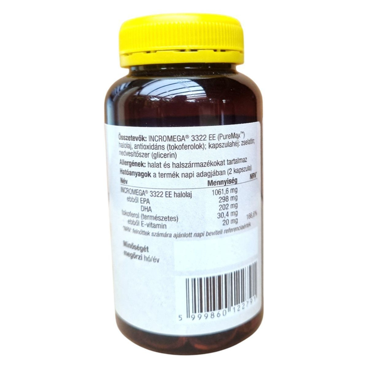INCROMEGA 3322 EE (PureMax) halolaj, antioxidáns (tokoferolok); kapszulahéj: zselatin, nedvesítőszer (glicerin)