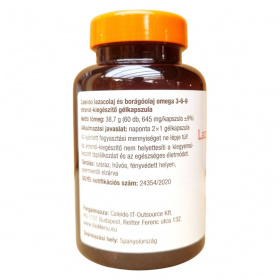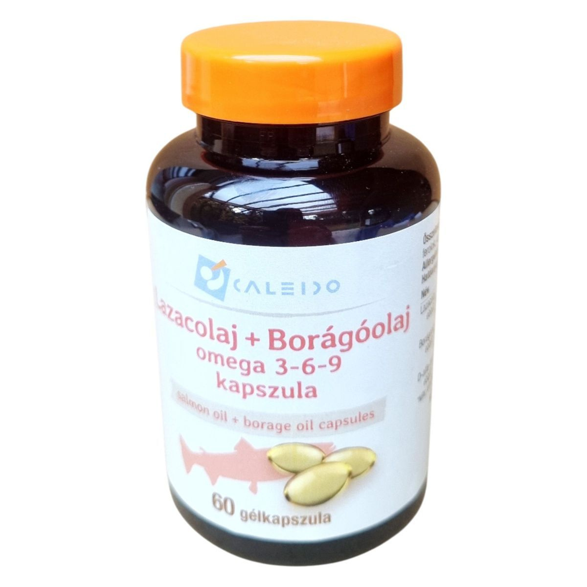 A Caleido Lazacolaj + Borágóolaj omega 3-6-9 kapszula egy étrend-kiegészítő, amely lazacolajat és borágóolajat tartalmaz. A termék 60 gélkapszulát tartalmaz, amelyek omega-3, omega-6 és omega-9 zsírsavakat biztosíthatnak. A termék antioxidáns hatású E-vitamint is tartalmaz, amely hozzájárulhat a sejtek védelméhez az oxidatív stresszel szemben. A termék Spanyolországból származik, és a Caleido IT-Outsource Kft. forgalmazza Magyarországon. Az ajánlott napi adag 2×1 gélkapszula, amelyet nem szabad túllépni. A termék halat és halszármazékokat tartalmaz, ezért allergiások számára nem ajánlott. Tárolása száraz, hűvös, fényvédett helyen javasolt, gyermekektől elzárva.