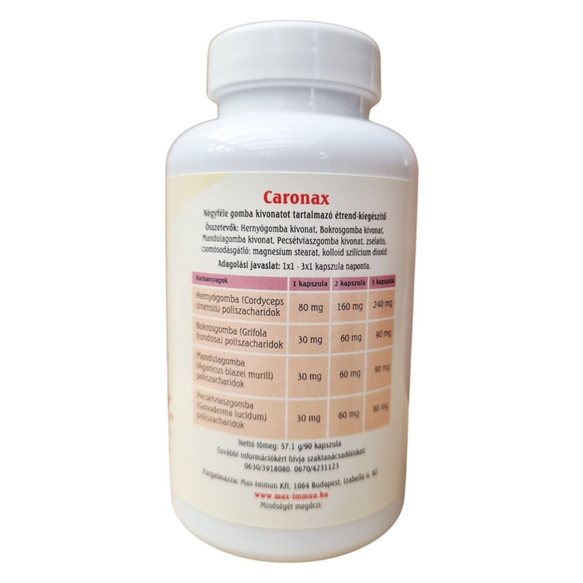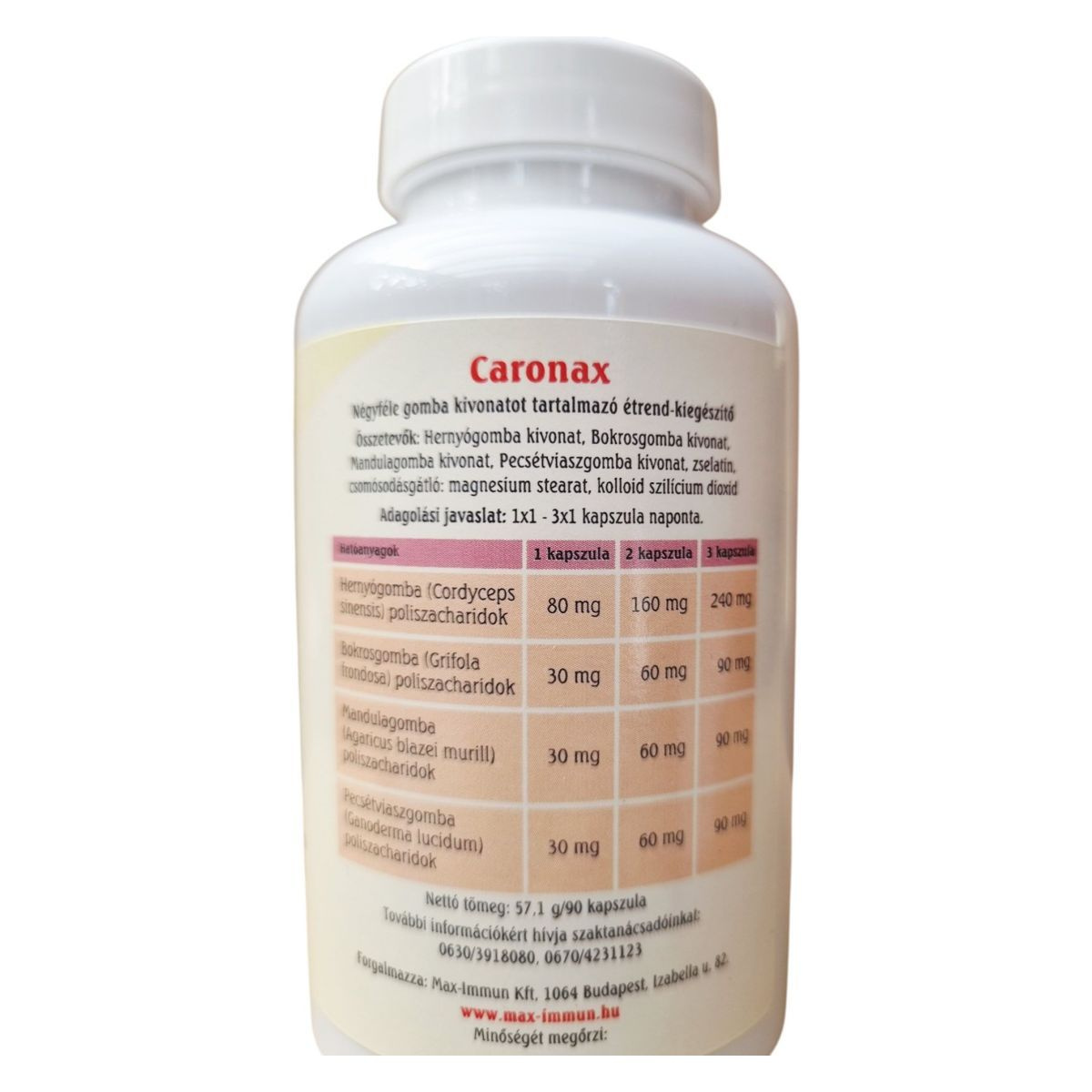 A Caronax étrend-kiegészítő négyféle gomba kivonatát tartalmazza, amelyek poliszacharidokban gazdagok lehetnek. A termék hernyógomba, bokrosgomba, mandulagomba és pecsétviaszgomba kivonatokat tartalmaz, amelyek hozzájárulhatnak az immunrendszer támogatásához. A kapszulák zselatint, valamint csomósodásgátló anyagokat, mint a magnézium sztearát és a kolloid szilícium dioxid tartalmaznak. A termék forgalmazója a Max-Immum Kft., és további információkért szaktanácsadóik elérhetők telefonon.