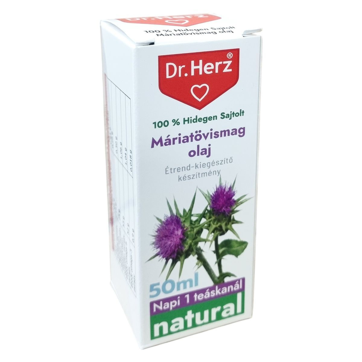 A Dr.Herz® 100 % hidegen sajtolt máriatövismag olaj természetes összetevőkből készül, és hidegen sajtolt eljárással állítják elő, hogy megőrizzék a kiváló minőségét. Termékeik között megtalálhatók vitaminok, étrend-kiegészítők, belsőleges oldatos cseppek, hidegen sajtolt olajok, 100% természetes illóolajok és gyógynövényes krémek. Különféle felhasználási területekre kínálnak megoldásokat, például immunerősítésre, fogyókúrára, méregtelenítésre, emésztés és anyagcsere támogatására, szív- és érrendszeri egészségre, csont-, porc- és ízületvédőként, valamint férfi és női egészség, illetve haj, bőr és köröm ápolására. A termék a megszokott napi étrend kiegészítésére alkalmas, és természetes összetételének köszönhetően támogatni tudja az egészséges életmódot.