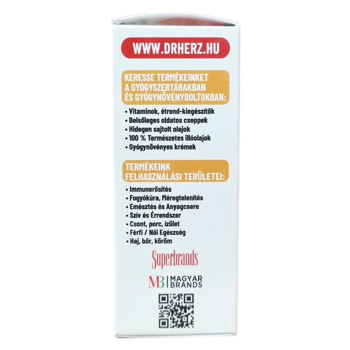 A Dr.Herz 100% hidegen sajtolt szőlőmagolaj készítmény természetes megoldásként támogatja az immunerősítést, fogyókúrát, méregtelenítést, az emésztést és anyagcserét, továbbá a szív és érrendszer, csontok, porcok, ízületek, valamint a haj, bőr és köröm egészségét. Termékeink megtalálhatók gyógyszertárakban és gyógynövényboltokban, széles választékban, többek között vitaminok, étrend-kiegészítők, belsőleges oldatos cseppek, hidegen sajtolt olajok, természetes illóolajok és gyógynövényes krémek formájában.