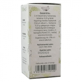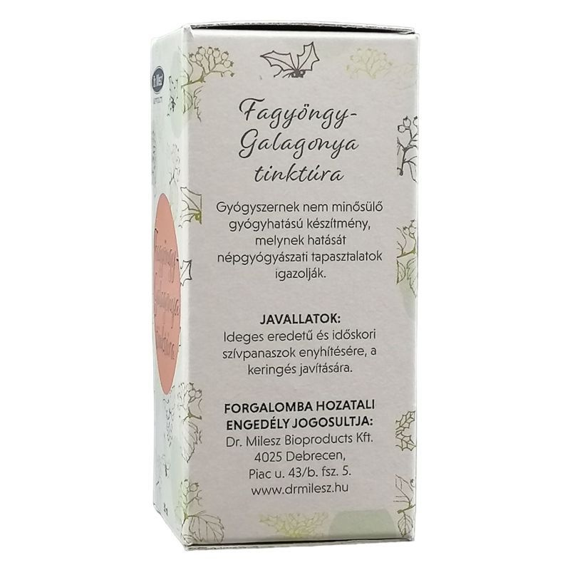 Mit kell tudnia a szedés megkezdése előtt? A készítmény egyszeri adagja (20 csepp) 0,30-0,32 g alkoholt tartalmaz, ezért a készítmény alkohol tartalmát figyelembe kell venni májbetegség és epilepszia esetén. Alkalmazása káros lehet alkoholbetegek, várandósak és gyermekek számára. Szedhetik-e a készítményt gyermekek is? A készítmény gyermekek számára nem alkalmazható figyelembe véve alkohol tartalmát és az alkalmazási területét. Szedhető-e a készítmény más gyógyszerekkel? A készítmény alkoholtartalma miatt az alkohollal kölcsönhatásba lépő gyógyszerekkel nem szedhető. Egyes szívre ható gyógyszerekkel (pl.: szívglikozidok), vérnyomáscsökkentőkkel együtt szedve, azok hatását fokozhatja. Szedhető-e várandóság és szoptatás idején? Ezen élethelyzetekben alkalmazása nem ajánlott. Hogyan és mikor kell a készítményt bevenni? A Fagyöngy-galagonya tinktúrát étkezések előtt kevés folyadékkal ajánlatos bevenni. Mi az ajánlott adag? Az ajánlott napi adag felnőtteknek: 3x20 csepp. Milyen nem kívánt hatást válthat ki a készítmény? A készítmény előírásszerű alkalmazása esetén nem ismeretesek mellékhatások. Ennek ellenére egyéni érzékenység a készítmény hatóanyagával szemben felmerülhet. Ilyen esetben forduljon orvosához, gyógyszerészéhez. Mire kell még ügyelnie a készítmény szedése során? A Fagyöngy-galagonya tinktúra gyermekek elől gondosan elzárandó! Mennyi ideig szedhető a készítmény? A készítmény hosszú ideig, kúraszerűen alkalmazható, általában 4-6 hét után célszerű néhány napos szünetet tartani. Hogyan kell tárolni a készítményt? Legfeljebb 25 fokon tárolandó.