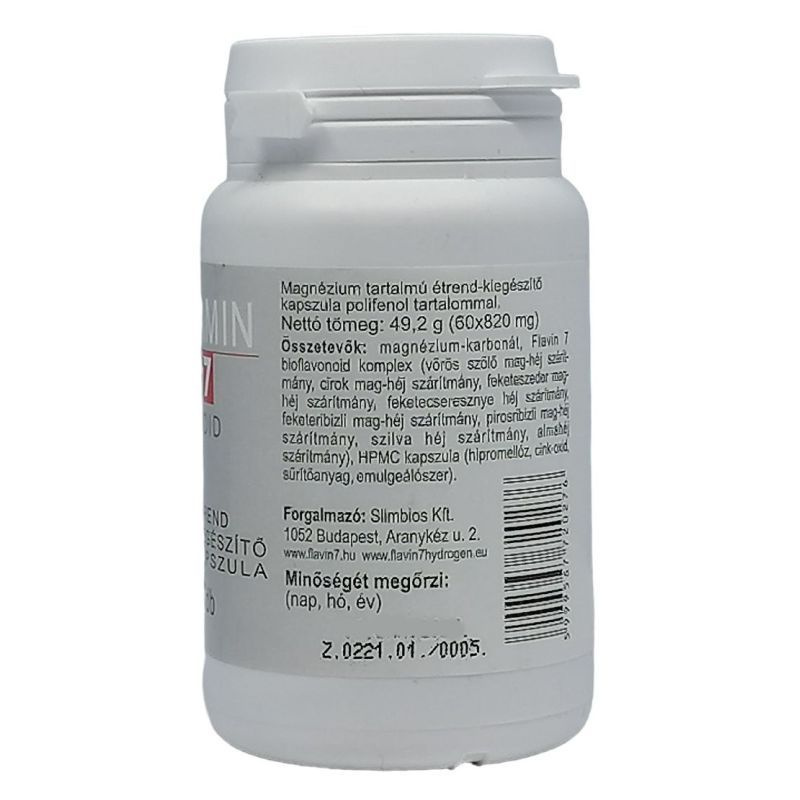A flavonoidokkal (amelyek a szabadgyökök káros hatása ellen védik a szervezetet) együtt a magnéziumnak nagy szerepe van a szív és érrendszeri betegségek megelőzésében. A csontanyagcsere fontos szereplője és számos enzim alkotórésze. Ajánlott napi bevitel: 1 kapszula. Az ajánlott napi mennyiséget ne lépje túl! Az étrend-kiegészítő nem helyettesíti a vegyes étrendet és az egészséges életmódot! Összetevők: Flavin 7 bioflavonoid komplex (vörös szőlő mag-héj szárítmány; cirok mag-héj szárítmány; feketeszeder mag-héj szárítmány; feketecseresznye héj szárítmány, feketeribizli mag-héj szárítmány, pirosribizli mag-héj szárítmány, szilva héj szárítmány almahéj szárítmány, magnézium-karbonát. A kapszula borítása: színezék (titán-dioxid), zselatin. A kapszula széthúzható és a benne lévő tartalom anélkül is elfogyasztható.