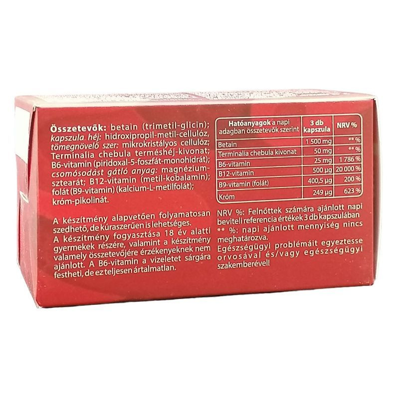 Betain alapú étrend-kiegészítő kapszula B-vitaminokkal és krómmal. Összetevők: Betain, Terminalia Chebula kivonat, B6-vitamin, B12-vitamin, B9-vitamin (folát), Króm