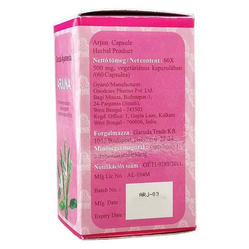Terminalia arjunát tartalmazó étrend-kiegészitő kapszula. Az Arjuna India ősi gyógyászata, az Ayurveda szerint az a növény, amelyik segít a szívet egészségesen tartani, ezért évezredek óta használja a szív erősítésére. Alkalmazása jótékony hatással van a szívizom működésére, csökkenti a feszültséget és a vérnyomást. Aktív hatóanyagai tartalmaznak tanninokat, flavonoidokat, fitoszterolokat, ezenkívül ásványokat mint pl. kalcium, magnézium, cink és réz. Az Arjuna kapszula kúraszerű szedésével Ön is hozzájárulhat szíve egészségének megőrzéséhez.