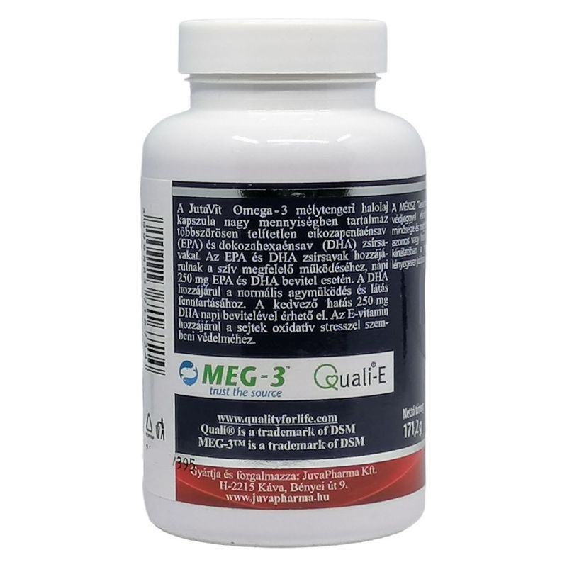 A JutaVit Omega-3 pro mélytengeri halolaj kapszula nagy mennyiségben tartalmaz többszörösen telítetlen EPA és DHA zsírsavakat.