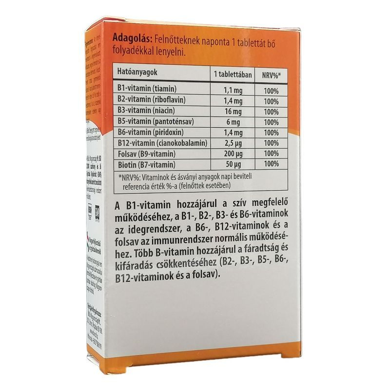 A B-vitaminokat "szépségünk forrása"-ként is emlegetik, hiszen egyes B-vitaminok (B2-, B3-vitaminok) fontos szerepet töltenek be a bőr, a biotin a haj normál állapotának fenntartásában. Adagolás: Felnőttek számára napi 1 tabletta szedését javasoljuk. A tablettát bő vízzel nyeljük le! Hatóanyagok 1 tablettában: B1-vitamin (tiamin) 1,1 mg, B2-vitamin (riboflavin) 1,4 mg, B3-vitamin (niacin) 16 mg, B5-vitamin (pantoténsav) 6 mg, B6-vitamin (piridoxin) 1,4 mg, B9-vitamin (folsav) 200 µg, B12-vitamin 2,5 µg, Biotin 50 µg. Összetevők: tömegnövelő szer (mikrokristályos cellulóz); maltodextrin; csomósodást gátlók (talkum, szilícium-dioxid); nikotinamid (B3-vitamin); kalcium-D-pantotenát (B5-vitamin); piridoxin-hidroklorid (B6-vitamin); riboflavin (B2-vitamin); tiamin-mononitrát (B1-vitamin); folsav (B9-vitamin); D-biotin; cianokobalamin (B12-vitamin). 27 g/ 90 db. OÉTI notifikációs szám:14650/2014. Tárolás: gyermekektől elzárva, száraz, hűvös, sötét helyen. Minőségét megőrzi (nap, hónap, év): lásd a doboz alján. Figyelmeztetés: Az étrend-kiegészítő fogyasztása nem helyettesíti a kiegyensúlyozott, változatos, vegyes étrendet, és az egészséges életmódot! Ne fogyasszon a napi ajánlott mennyiségnél többet! A készítményt tartsa gyermekektől elzárva! A "BioCo" bejegyzett cégnevet, és nem ökológiai tanúsítást jelent!