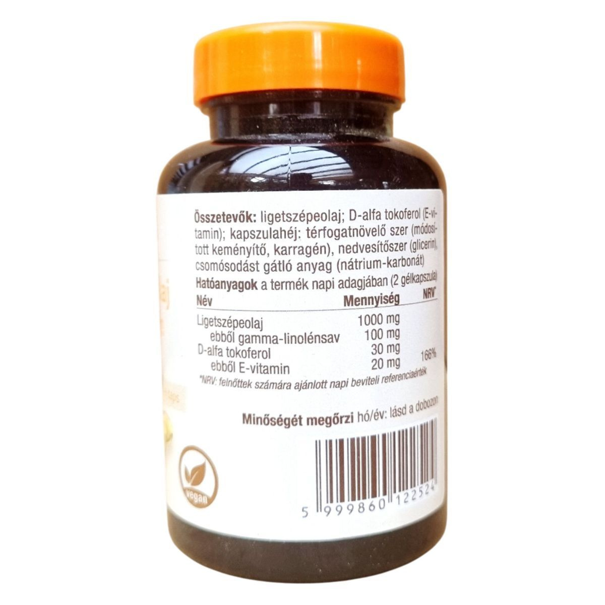 Ligetszépeolaj, D-alfa tokoferol (E-vitamin), kapszulahéj: térfogatnövelő szer (módosított keményítő, karragén), nedvesítőszer (glicerin), csomósodást gátló anyag (nátrium-karbonát).