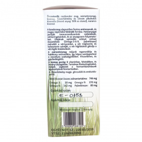 A készítmény rostkender-, máriatövis-, len- és fűszerköménymag kivonatait tartalmazza. A kendermag Omega-3, -6 és -9 zsírsavakat biztosít, hozzájárul a normál koleszterin- és trigliceridszint fenntartásához és az immunrendszer normál működéséhez. A máriatövis támogatja a máj regeneráló és antioxidáns folyamatait, a lenmag tápanyagokban gazdag, a fűszerkömény az emésztési funkciók javítását segíti. Az étrend-kiegészítő használata nem helyettesíti a kiegyensúlyozott, vegyes étrendet és az egészséges életmódot.