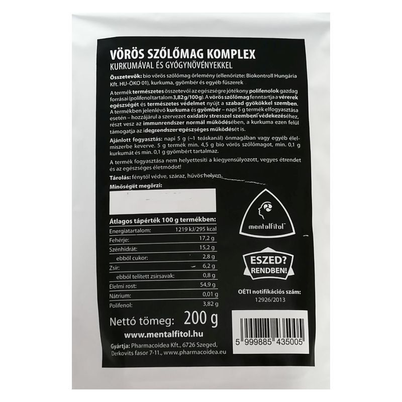 A vörös szőlőmag őrleményhez hozzáadott kurkuma és gyömbér - napi 5 g termék elfogyasztása esetén - hozzájárul a szervezet oxidatív stresszel szembeni védekezéséhez, részt vesz az immunrendszer normál működésében, a kurkuma ezen felül támogatja az idegrendszer egészséges működését is. A Mentalfitolt tartalmazó vörösszőlőmag őrleményben nem található semmilyen állati eredetű összetevő.