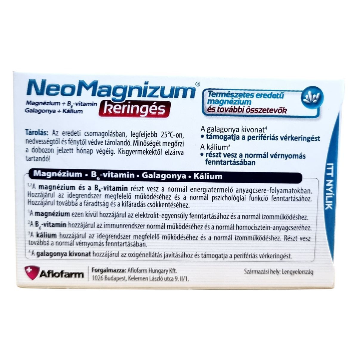 A NeoMagnizum® tabletta magnéziumot, B6-vitamint, galagonya kivonatot és káliumot tartalmaz, amelyek támogathatják a normál vérkeringést és vérnyomást, valamint hozzájárulhatnak az idegrendszer és az izomműködés megfelelő működéséhez.