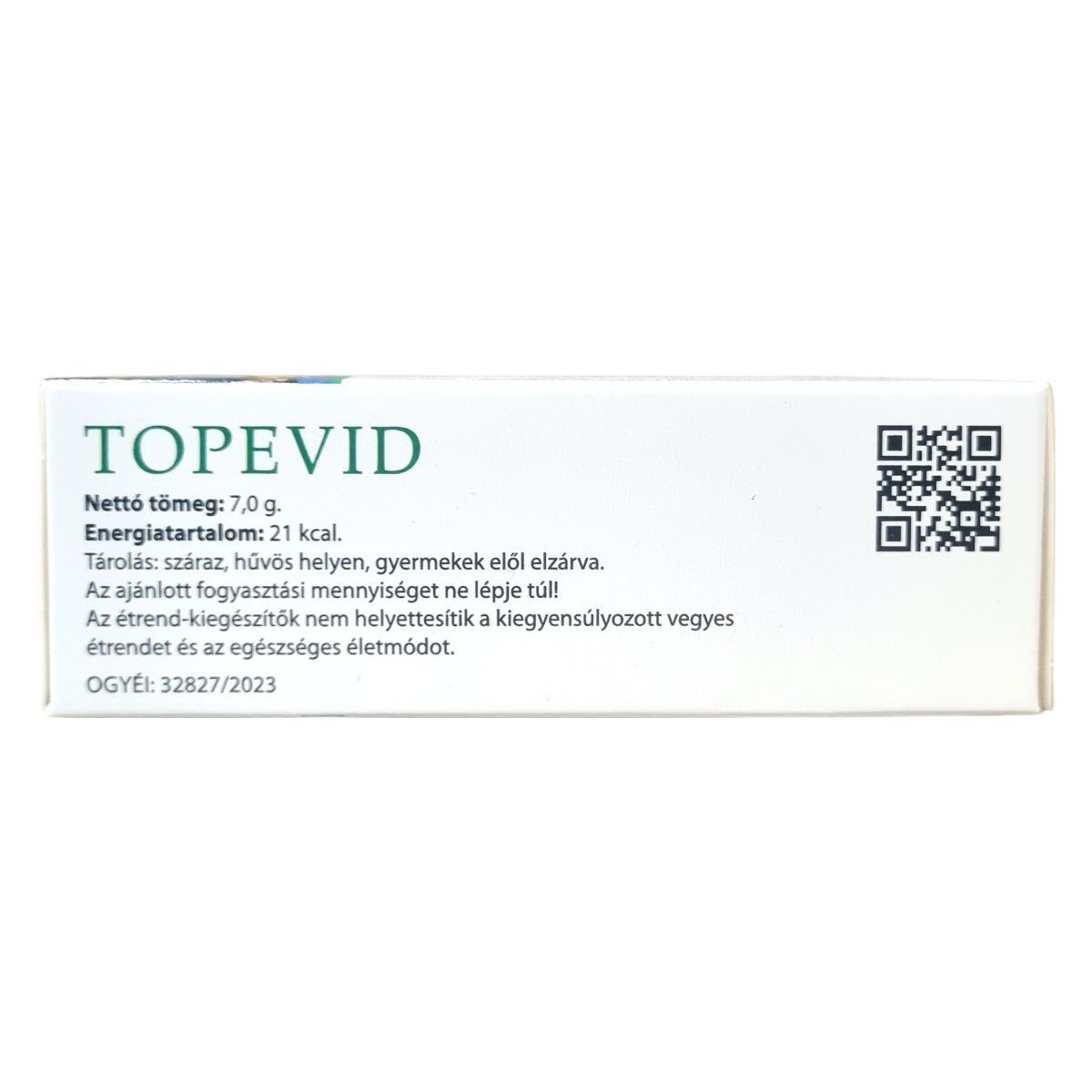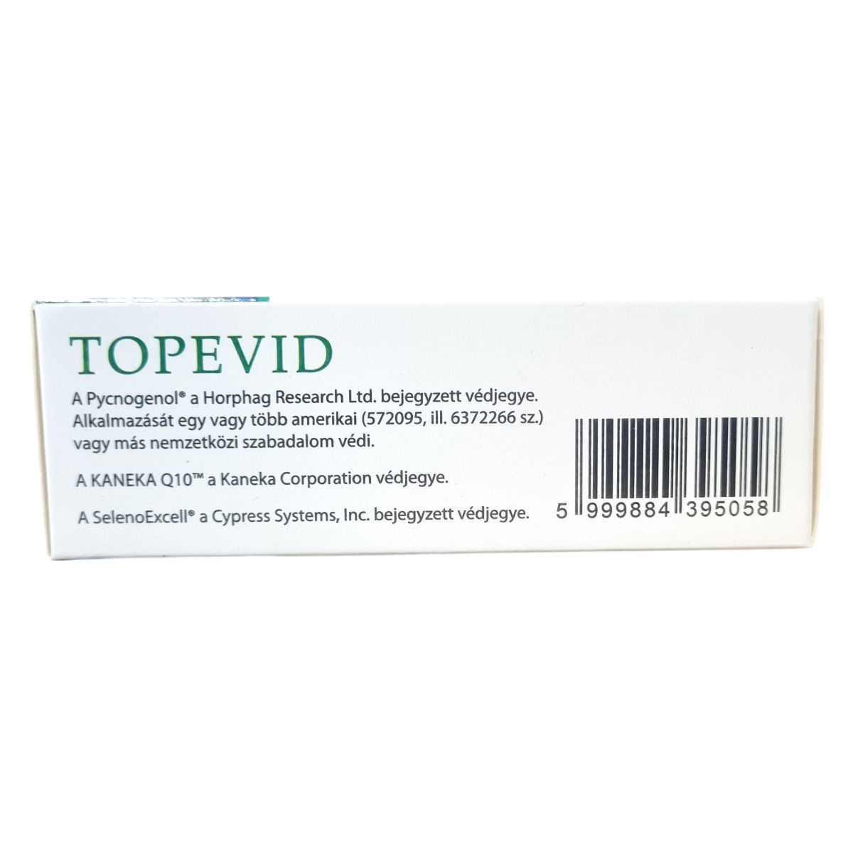 A TOPEVID étrend-kiegészítő kapszula Pycnogenol®, Co Q10 és szerves szelén kombinációját tartalmazza, melyek együttesen hozzájárulhatnak a szervezet antioxidáns védelméhez. A Pycnogenol® a Horphag Research Ltd. bejegyzett védjegye, alkalmazása több amerikai és nemzetközi szabadalom által védett. A Coenzyme Q10 (Kaneka Q10™) a Kaneka Corporation védjegye, míg a szerves szelén (SelenoExcell®) a Cypress Systems, Inc. bejegyzett védjegye, amely szeleindúsított élesztőből származik. A kapszula nem tartalmaz hozzáadott cukrot, sót, keményítőt, laktózt, glutént, valamint szintetikus ízesítőket és tartósítószereket, így megfelelő választás lehet bizonyos étrendi igények mellett is. A kapszula zselatin alapú, valamint nem állati eredetű magnézium-sztearáttal készül. A termék nettó tömege 7 gramm, és energiája 21 kcal. A gyártás és forgalmazás a Siema Vital Kft. feladata, melynek székhelye Budapesten található.