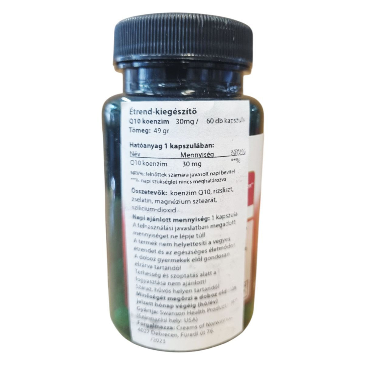 A Swanson CoQ10 étrend-kiegészítő 60 kapszulás kiszerelésben érhető el, és kapszulánként 30 mg Q10 koenzimet tartalmaz. A termék célja, hogy támogassa a szív- és érrendszer egészségét. Az összetevők között megtalálható a rizsliszt, zselatin, magnézium sztearát és szilícium-dioxid. A termék használata során fontos, hogy ne lépjük túl az ajánlott napi mennyiséget, és tartsuk távol gyermekektől. Terhesség és szoptatás alatt nem ajánlott a fogyasztása. A terméket száraz, hűvös helyen kell tárolni. A Swanson Health Products Inc. által gyártott terméket a Creams of Norway Kft. forgalmazza Magyarországon.