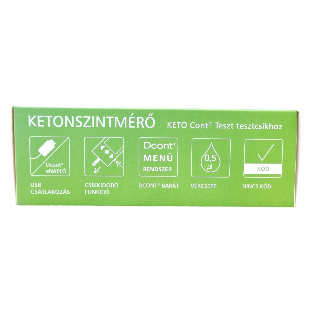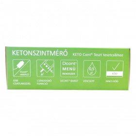 A készülék a KETO Cont® Teszt tesztcsíkokkal együtt használható vérketonszint mérésére, gyors eredményt biztosítva önellenőrzési célokra.