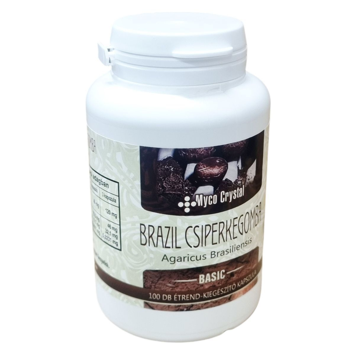 A Myco Crystal Basic brazil csiperkegomba (Agaricus Brasiliensis) étrend-kiegészítő kapszula 100 darabos kiszerelésű termék, nettó tömege 62 g (100 db x 620 mg). A készítmény fő hatóanyagát a brazil csiperkegomba kivonata adja, mely 1:10 arányban koncentrált. Kiegészítésként Flavin 7 bioflavonoid komplexet tartalmaz, amely különböző gyümölcskivonatokat foglal magában, mint például vörös szőlő, feketeszeder, feketecseresznye és más bogyós gyümölcsök maghéja és héja. A kapszula HPMC (hipromellóz) alapú, cink-oxiddal, sűrítőanyaggal és emulgeálószerrel. A termék a napi három kapszula bevételével alkalmazható, ajánlott bő vízzel lenyelni. A kapszulák rendszeres fogyasztása hozzájárulhat az egészséges életmód fenntartásához, azonban nem helyettesíti a változatos, kiegyensúlyozott étrendet.