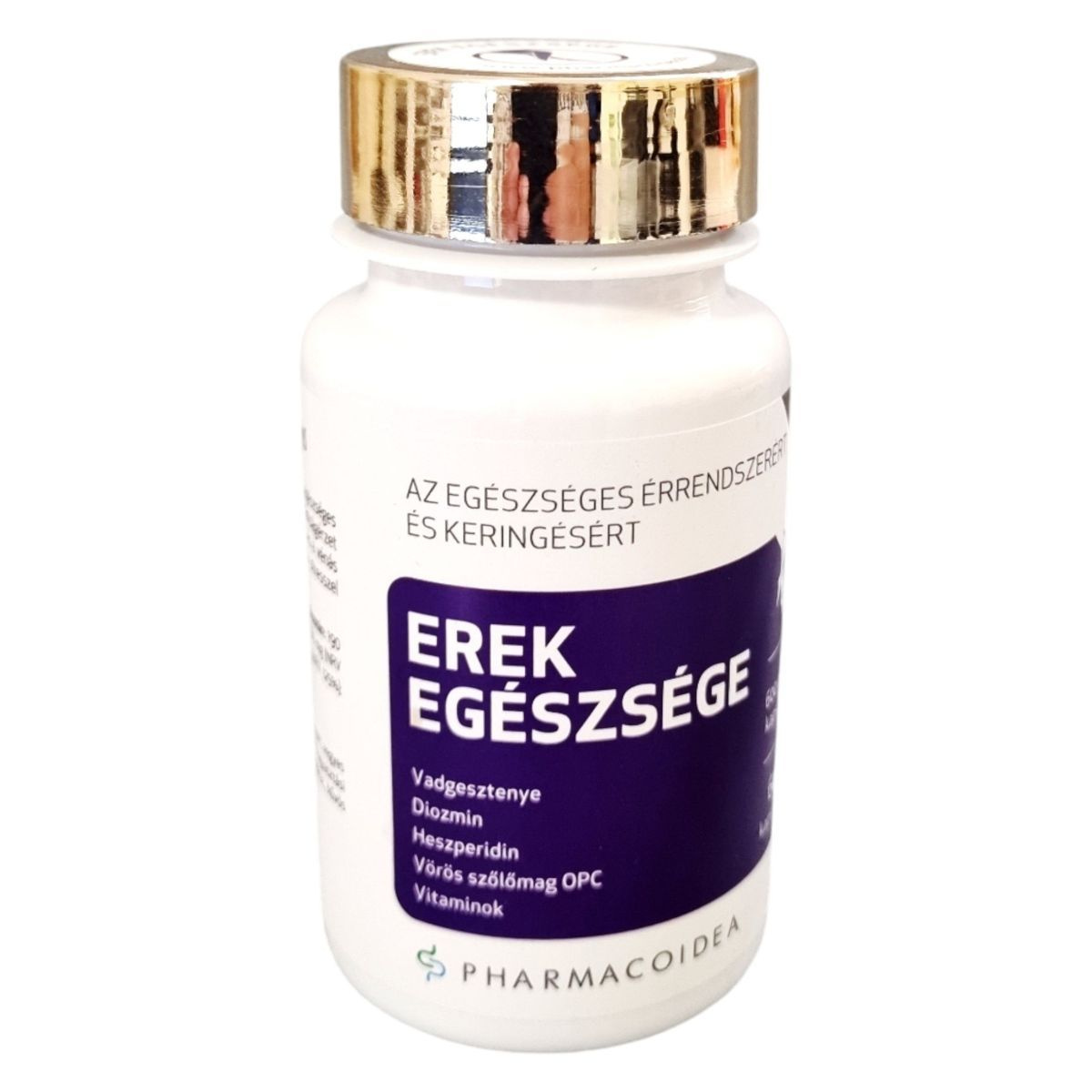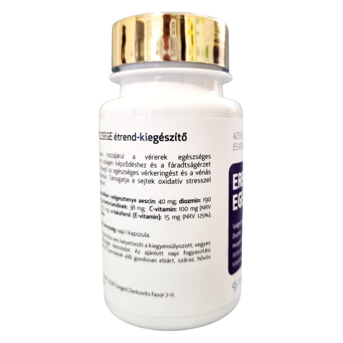 Az EREK EGÉSZSÉGE étrend-kiegészítő napi 1 kapszulája hozzájárulhat a vérerek egészséges működéséhez, a kollagén képződéséhez, és csökkentheti a fáradtságérzetet. A termék elősegítheti az egészséges vérkeringést és a vénás véráramlást a lábakban, valamint támogathatja a sejtek oxidatív stresszel szembeni védekezését. A hatóanyagok között megtalálható a vadgesztenye aescin, diozmin, vörös szőlőmag proantocianidinek, C-vitamin, heszperidin és a-tokoferol (E-vitamin). A termék gyártója a Pharmacoidea Kft., és az OGYÉI notifikációs száma 15875/2015.