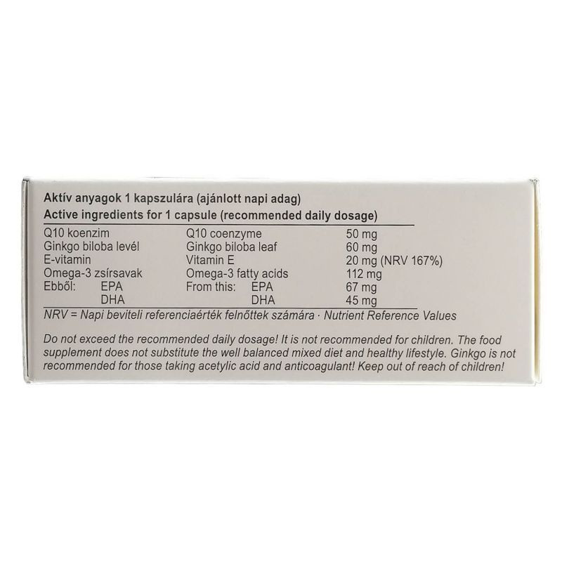 A többszörösen telítetlen omega-3 zsírsavak hozzájárulnak a normál triglicerid szint, a normál vérnyomás, az egészséges szívműködés és a normális véralvadás fenntartásához. A ginkgo flavonoidok hozzájárulnak a keringési rendszer normál működéséhez, illetve antioxidánsként viselkednek. A hatóanyagok rendszeres fogyasztásával hozzájárulhatunk az időskori agyműködés megfelelő szinten tartásához. A készítményhez adott E-vitamin fontos antioxidáns hatású vitamin, szerepet játszik az immunrendszer megfelelő működésében. Naponta 1 kapszula szedése javasolt.