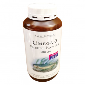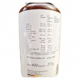 Az Omega-3 halolaj kapszula a SANCT BERNHARD márkától 400 kapszulás kiszerelésben érhető el. A termék magas minőségű, biológiailag aktív Omega-3 zsírsavakat tartalmaz, melyek közül az EPA és DHA különösen fontosak lehetnek a szív- és érrendszer támogatásában. Az E-vitamin antioxidáns hatása révén hozzájárulhat a sejtek védelméhez. A termék Németországban készül, és a Kräuterhaus Sanct Bernhard KG gyártja. A kapszulák halolajat, nedvesítőszert (glicerin) és E-vitamint tartalmaznak, és napi 2 kapszula fogyasztása javasolt felnőttek számára. Fontos, hogy a terméket gyermekektől elzárva tartsuk, és ne lépjük túl az ajánlott napi mennyiséget.