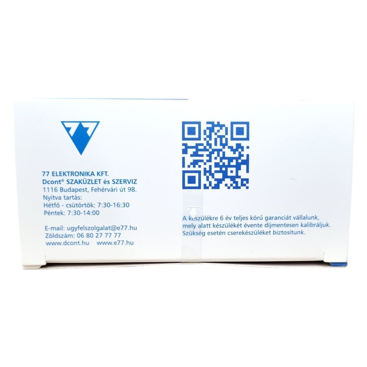 A készülékre 6 év teljes körű garanciát vállalnak, amely idő alatt évente díjmentes kalibrálást biztosítanak, és szükség esetén cserekészüléket adnak. A Dcont® szaküzlet és szerviz címe: 1116 Budapest, Fehérvári út 98.