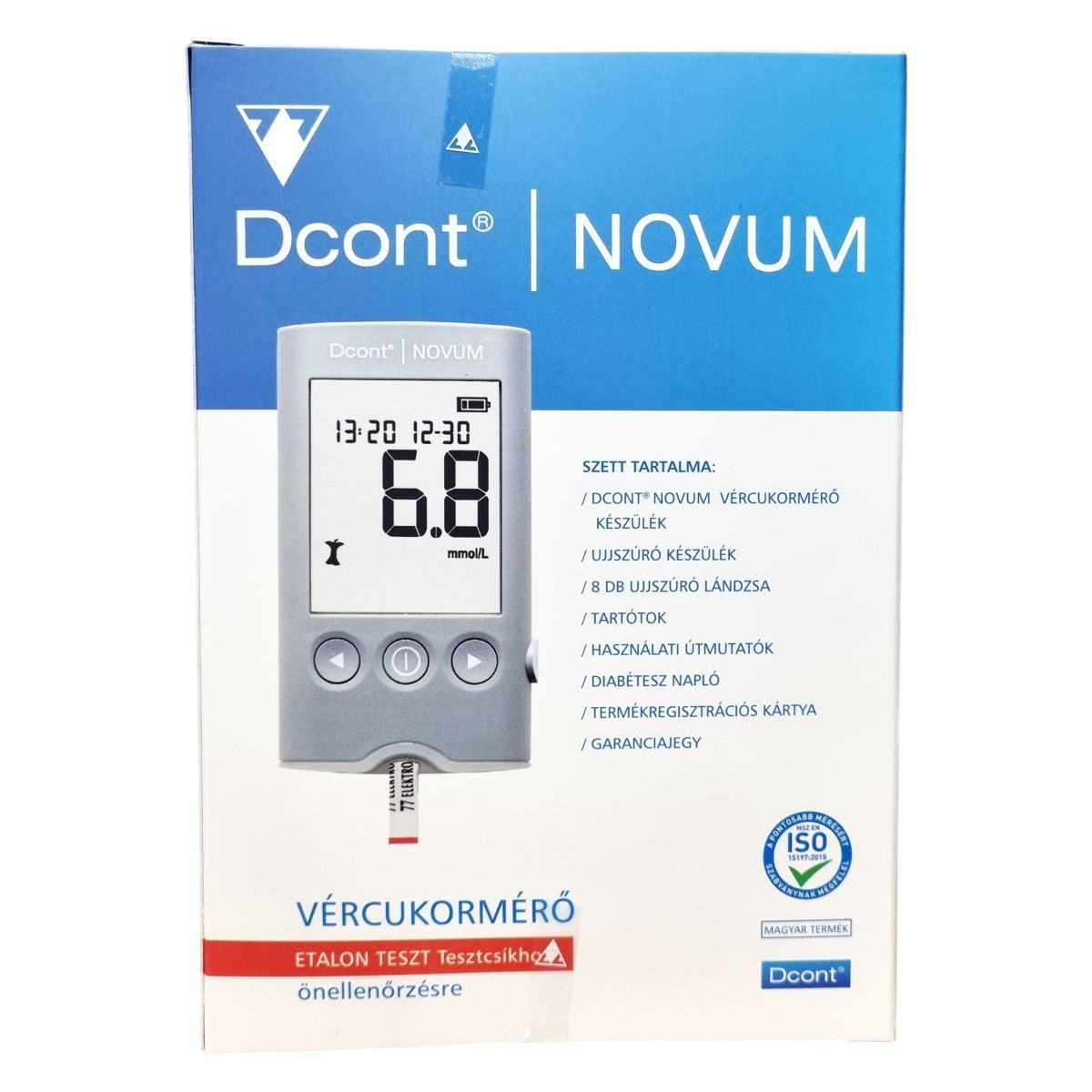 A Dcont® NOVUM vércukormérő készülék önellenőrzésre készült, ETALON TESZT tesztcsíkkal használható, és megfelel az ISO 15197:2015 szabványnak. Magyar termék, Dcont® márkanév alatt forgalmazva.