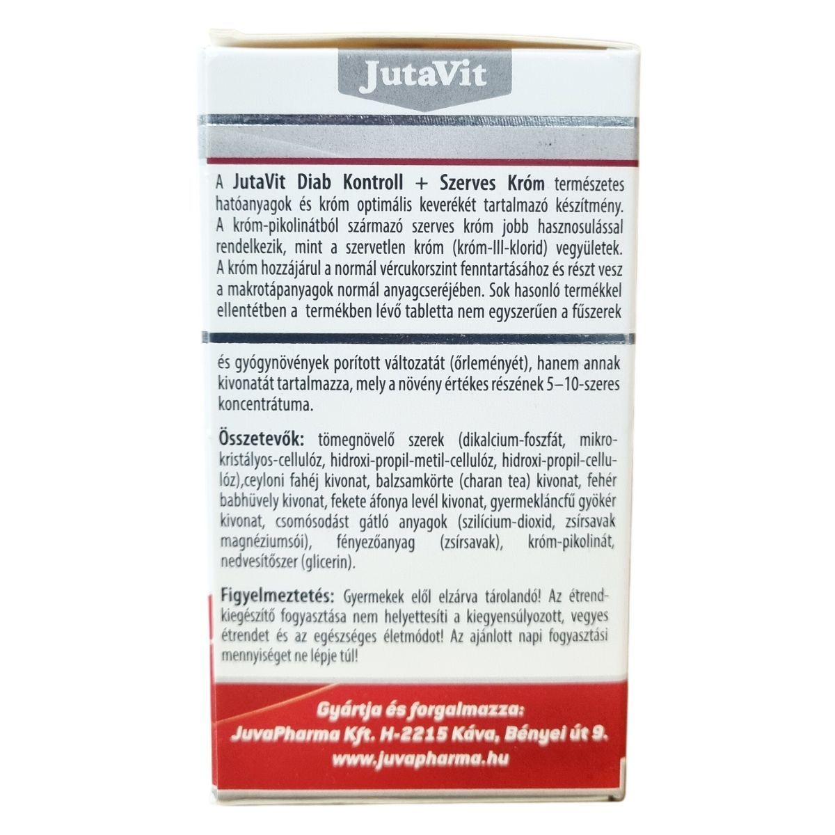 A JutaVit Diab Kontroll + Szerves Króm készítmény természetes hatóanyagok és króm optimális keverékét tartalmazza. A króm-pikolinátból származó szerves króm jobb hasznosulást biztosíthat, mint a szervetlen króm vegyületek. A króm hozzájárulhat a normál vércukorszint fenntartásához és részt vehet a makrotápanyagok anyagcseréjében. A termékben található tabletták nem egyszerűen az összetevők őrleményét, hanem azok 5–10-szeres koncentrátumú kivonatát tartalmazzák, amelyek így a növények értékes részeit adják át. A termék mesterséges színezéket nem tartalmaz.