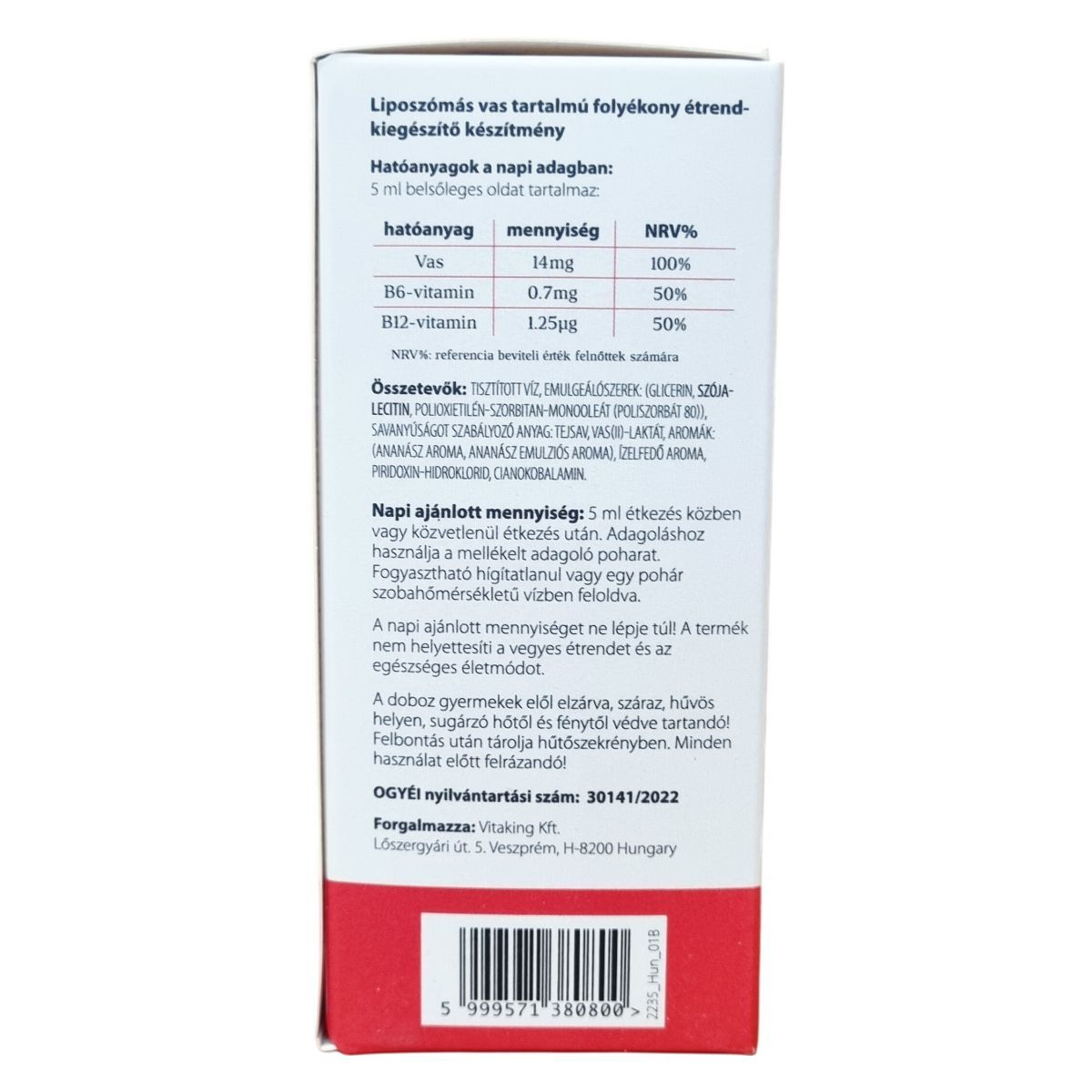 A VitaFer·L folyékony formában készült étrend-kiegészítő, amely liposzómás technológiával tartalmaz vasat, így elősegítheti a vas jobb hasznosulását a szervezetben. A vas hozzájárulhat a normál szellemi működéshez, a fáradtság csökkentéséhez, valamint szerepet játszhat a hemoglobin és a vörösvérsejtek képződésében. A termékben található B12-vitamin támogatni segítheti az ideg- és immunrendszer normál működését. Az adagolás során napi 5 ml javasolt, amely fogyasztható hígítatlanul vagy vízben feloldva. Az adagoláshoz a dobozban mellékelt adagolópohár használata ajánlott. A terméket gyermekek elől elzárva, fénytől és hőtől védve, száraz, hűvös helyen kell tárolni, a felbontás után hűtőszekrényben kell tartani és használat előtt fel kell rázni.
