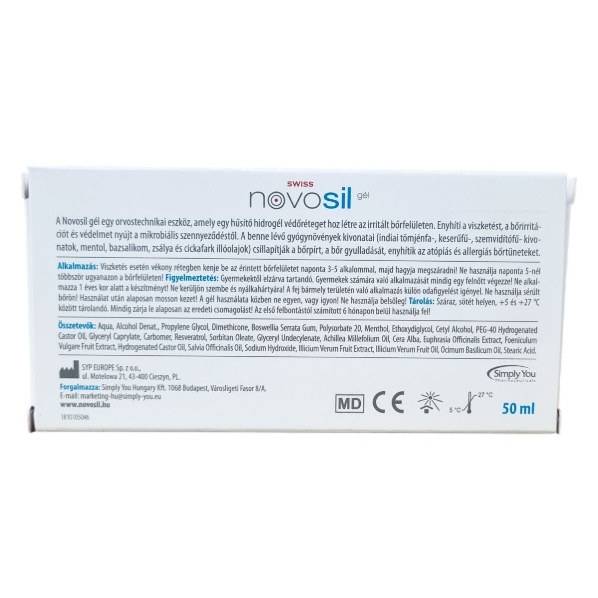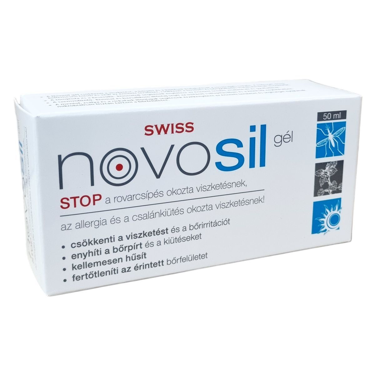 A Novosil gél olyan orvostechnikai eszköz, amely hidrogel rétegként hűsíti és védi az irritált bőrfelületet, csökkentve a viszketést, bőrpírt és a kiütéseket, továbbá segít megelőzni a fertőzések és bőrgyulladások kialakulását. A benne található gyógynövény kivonatok és illóolajok, mint az indiai tömjénfa, keserűfű, szemvidítófű, mentol, bazsalikom, zsálya és cickafark természetes módon enyhítik a bőrirritációt, csillapítják az allergiás és atópiás bőrtüneteket, valamint mikrobiális tisztán tartják az érintett bőrfelületet.