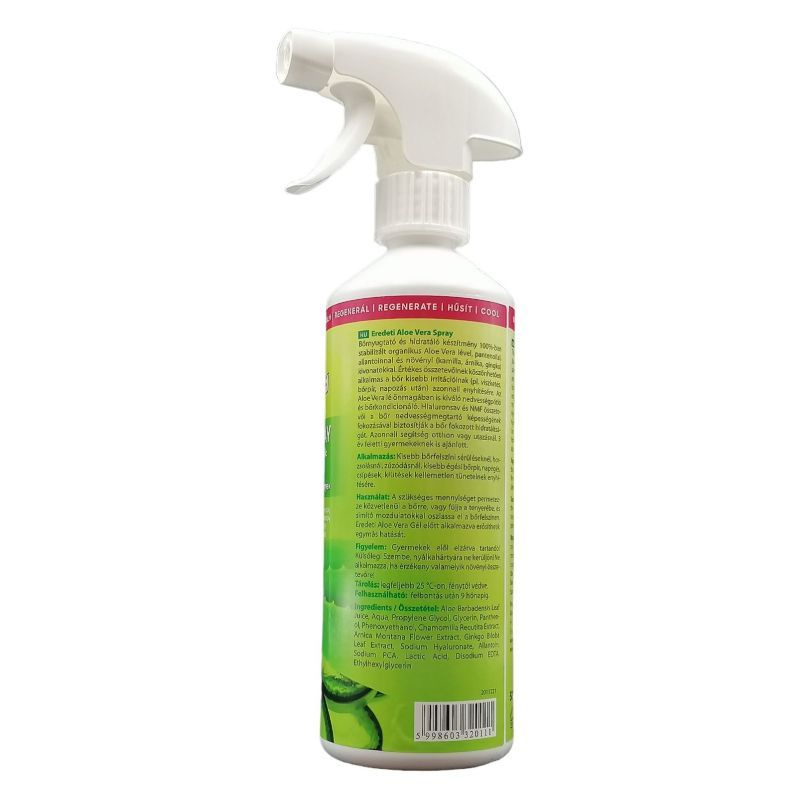 Az Eredeti Aloe Vera spray 100 %-ban stabilizált Aloe Vera gélt tartalmaz. Ez a nyugtató hatású spray a köztudottan gyógyító hatású Aloe Vera gélen kívül számos fontos gyógynövény-kivonatot is tartalmaz (Allantoin, Sodium Hyaluronate, Panthenol, Gyöngyvessző, Tigrisfű, Római Kamilla, Orvosi Zsálya, Páfrányfenyő, Fekete Bodza, Almasav, Aminosavak). Használat: elsősorban felületi sérülések esetén fújja be a sérült bőrfelületet, és ezt többször ismételje meg. Alkalmazhatja az Aloe Vera Gél előtt is, így a két termék erősíti egymás hatását.