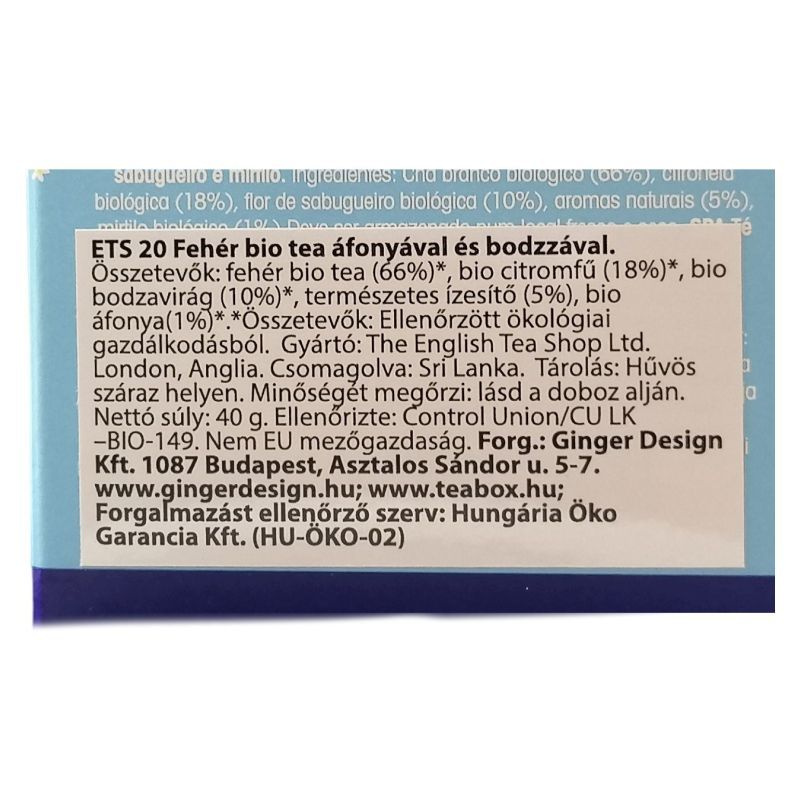 Összetevők: fehér tea*, citromfű*, bodza*, fekete áfonya*, természetes fekete áfonya ízesítéssel.