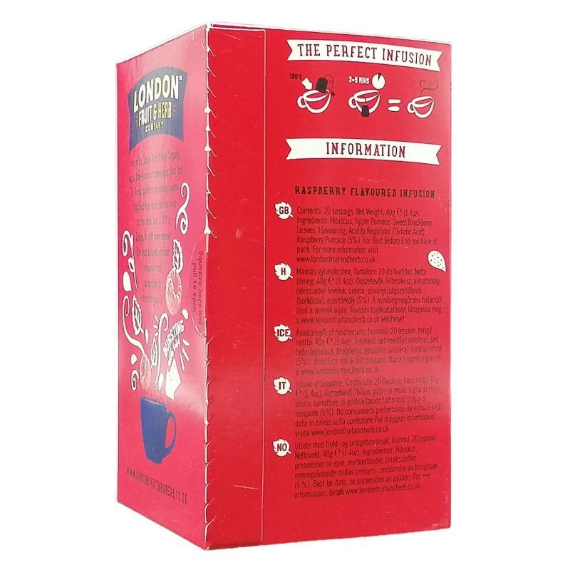 Összetevők: hibiszkusz, alma gyümölcshús, szederlevél, málnalé, málna gyümölcshús, tejsav, csipkebogyó, természetes ízesítők. 20 önállóan csomagolt tea filter.