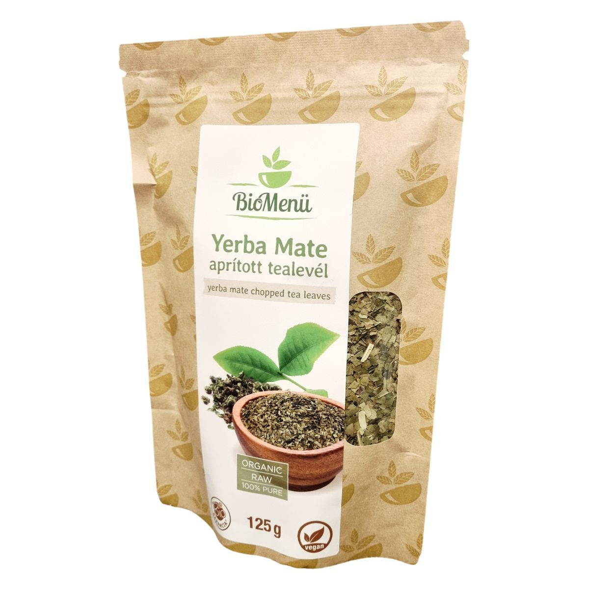 A BioMenü BIO Yerba Mate egy aprított tealevél, amely Brazíliából származik és 125 grammos kiszerelésben érhető el. Az ajánlott felhasználási mód szerint 3 gramm tealevelet 2 ml hideg vízzel nedvesítve, majd 180 ml forró vízzel leöntve készítjük el az italt. A termék 100% tiszta, organikus eredetű, és megfelel a bio, nyers valamint vegán étrendi irányzatoknak. A termék koffeintartalmú, ezért bizonyos csoportok számára nem javasolt a fogyasztása. Tartása során fontos, hogy jól zárt, száraz, hűvös és fényvédett helyen tároljuk. Mivel természetes eredetű termékről van szó, előfordulhat, hogy táplálkozási tulajdonságai a környezeti tényezők és az idő múlásával változhatnak.