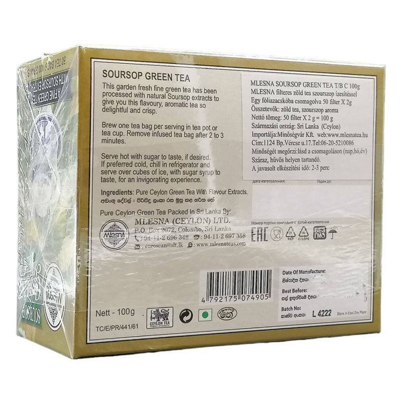 Filteres zöld tea aromazáró fóliazacskóba csomagolva. Összetevők: zöld tea, soursop aroma.