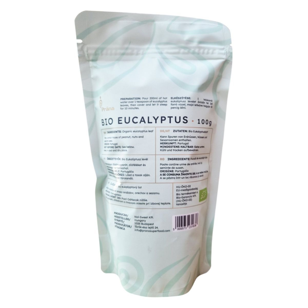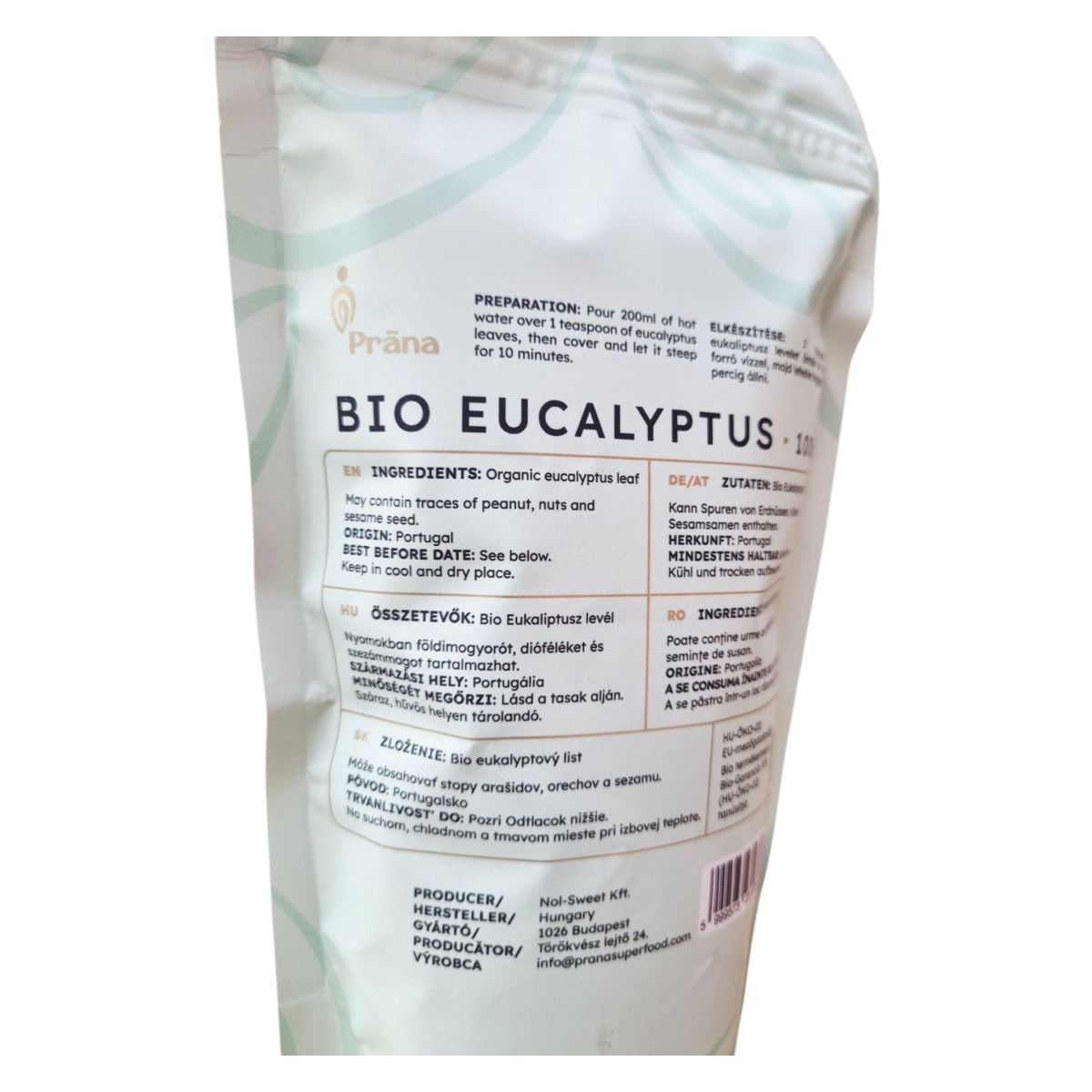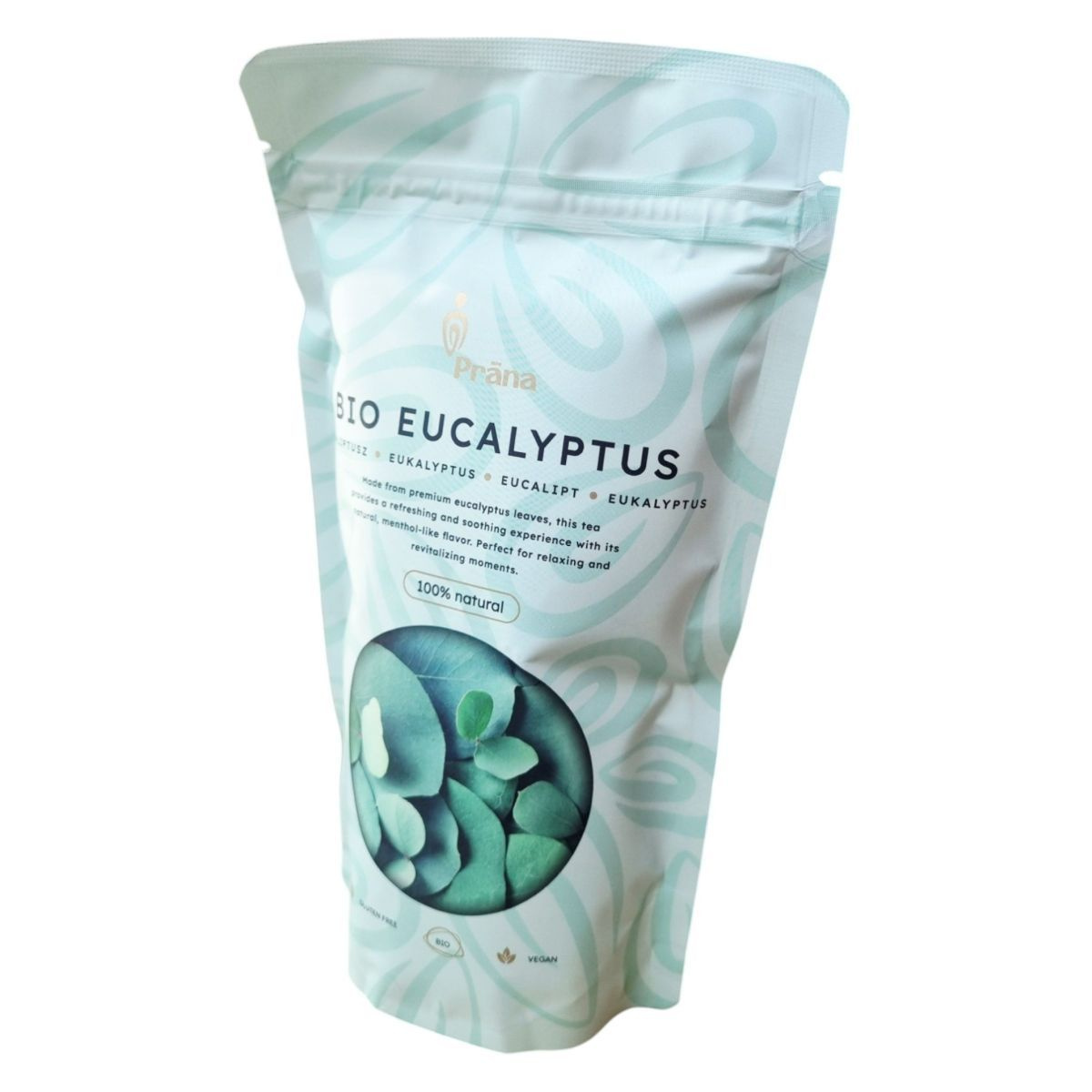 A Prána BIO EUCALYPTUS tea Portugáliából származó, organikus eukaliptusz levelekből készül. A termék 100% természetes, gluténmentes, bio és vegán, így széles körben fogyasztható. A tea elkészítése egyszerű: 1 teáskanál levelet 200 ml forró vízzel kell leönteni, majd 10 percig lefedve állni hagyni. A termék nyomokban tartalmazhat földimogyorót, dióféléket és szezámmagot, ezért allergiások számára fontos lehet az összetevők ellenőrzése. A tea frissítő és nyugtató hatású lehet, ideális választás lehet pihenéshez és feltöltődéshez.